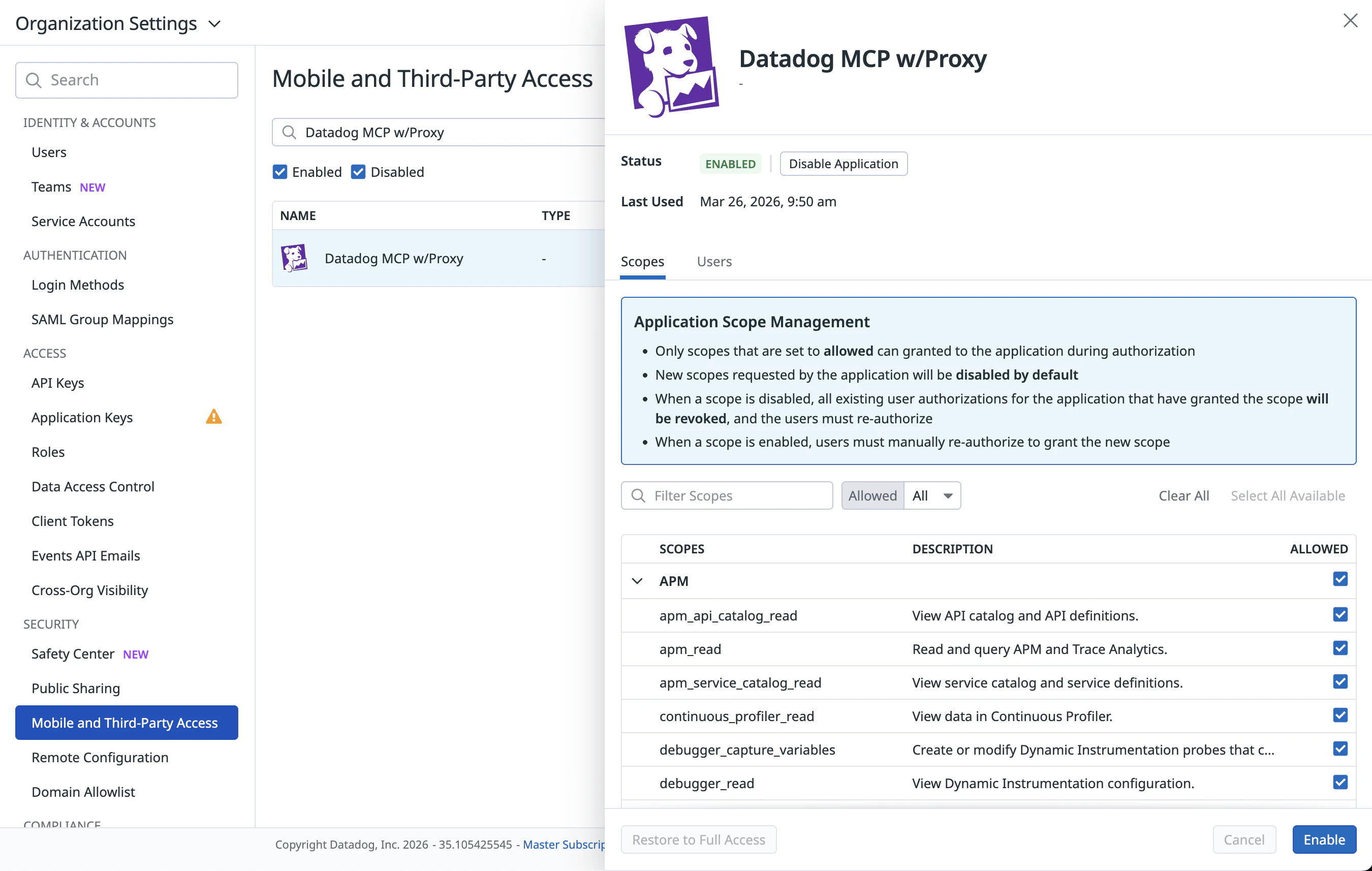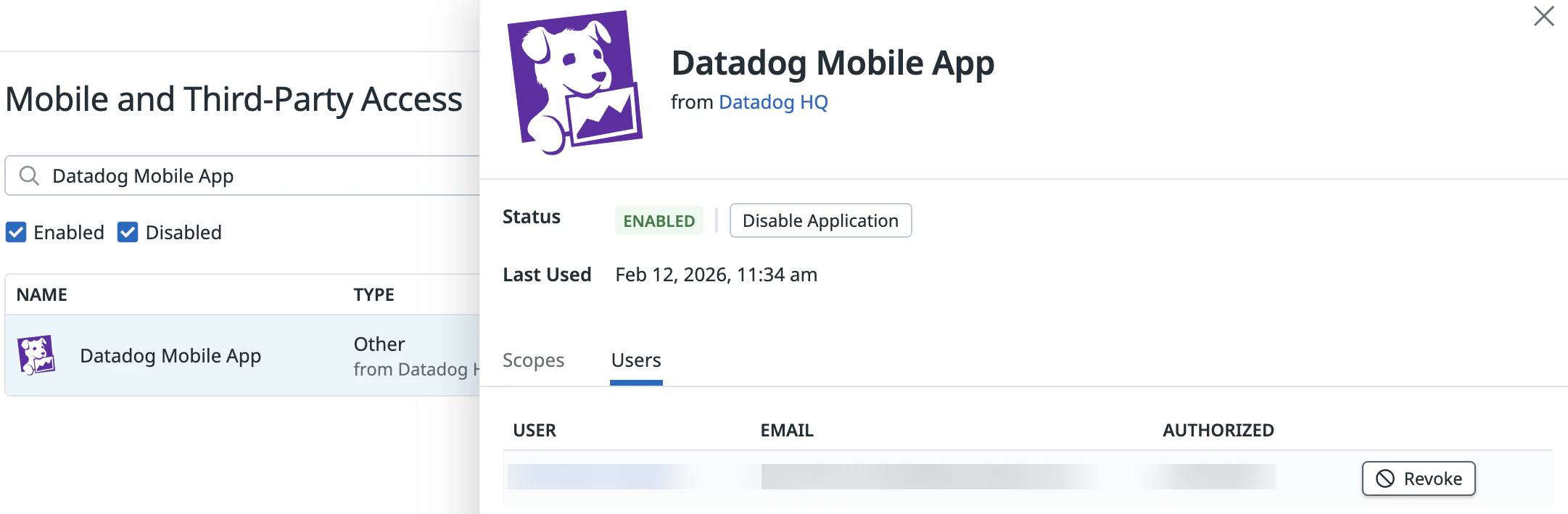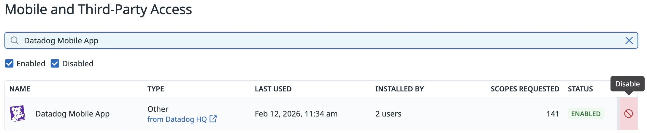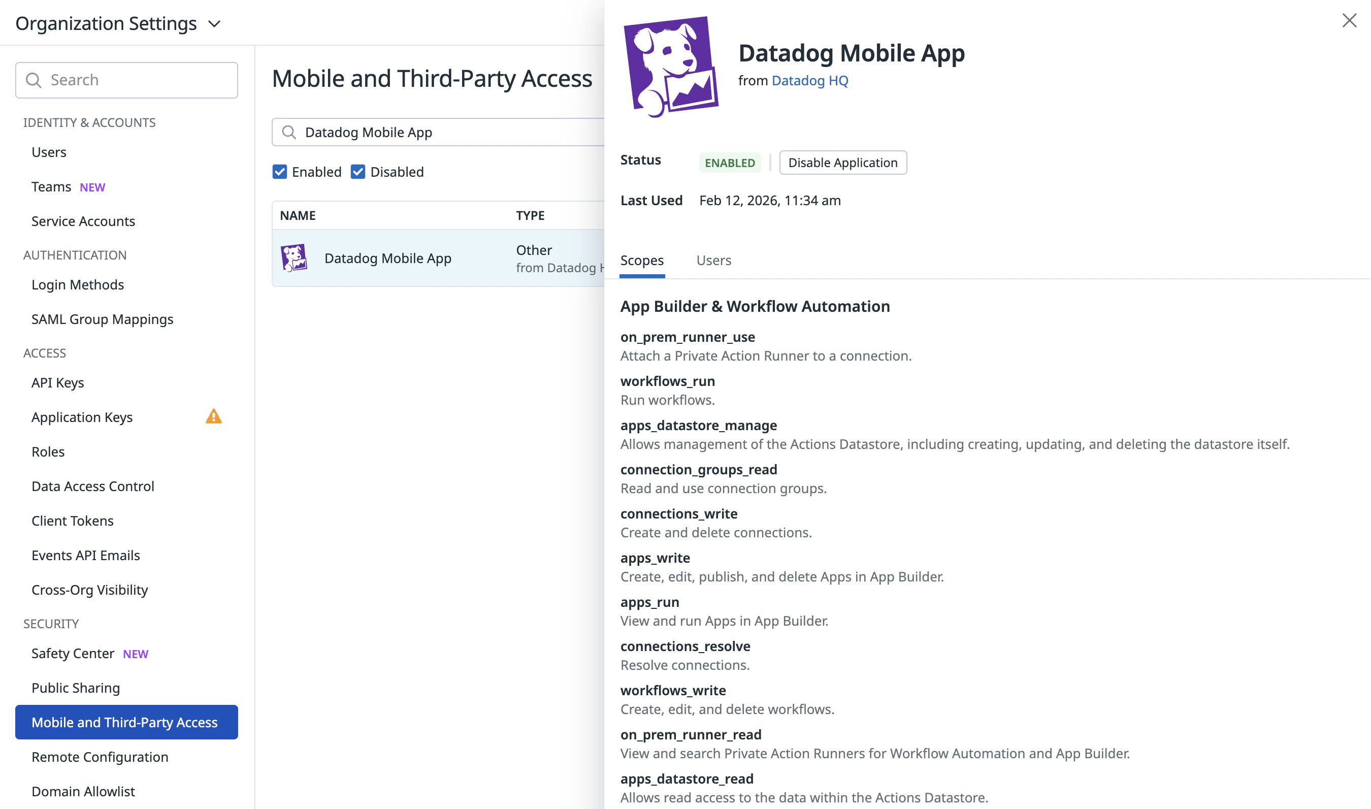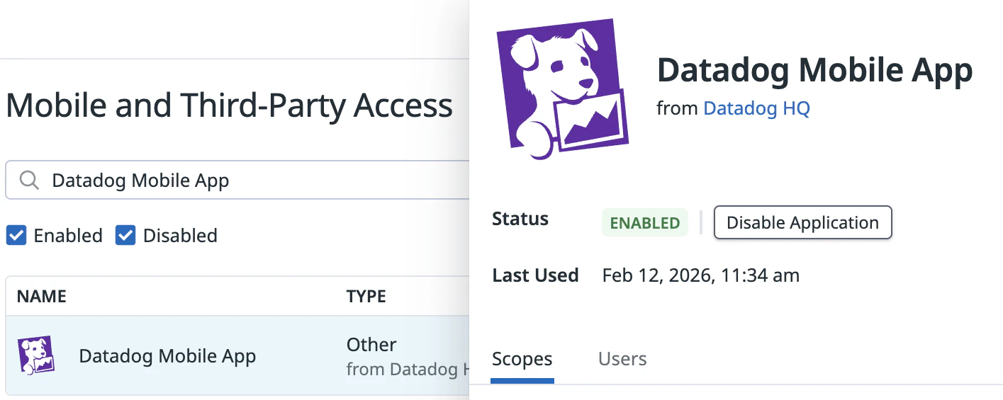 Enabled OAuth applications allow users with necessary permissions to authorize access on their behalf. OAuth applications include the Datadog Mobile App.