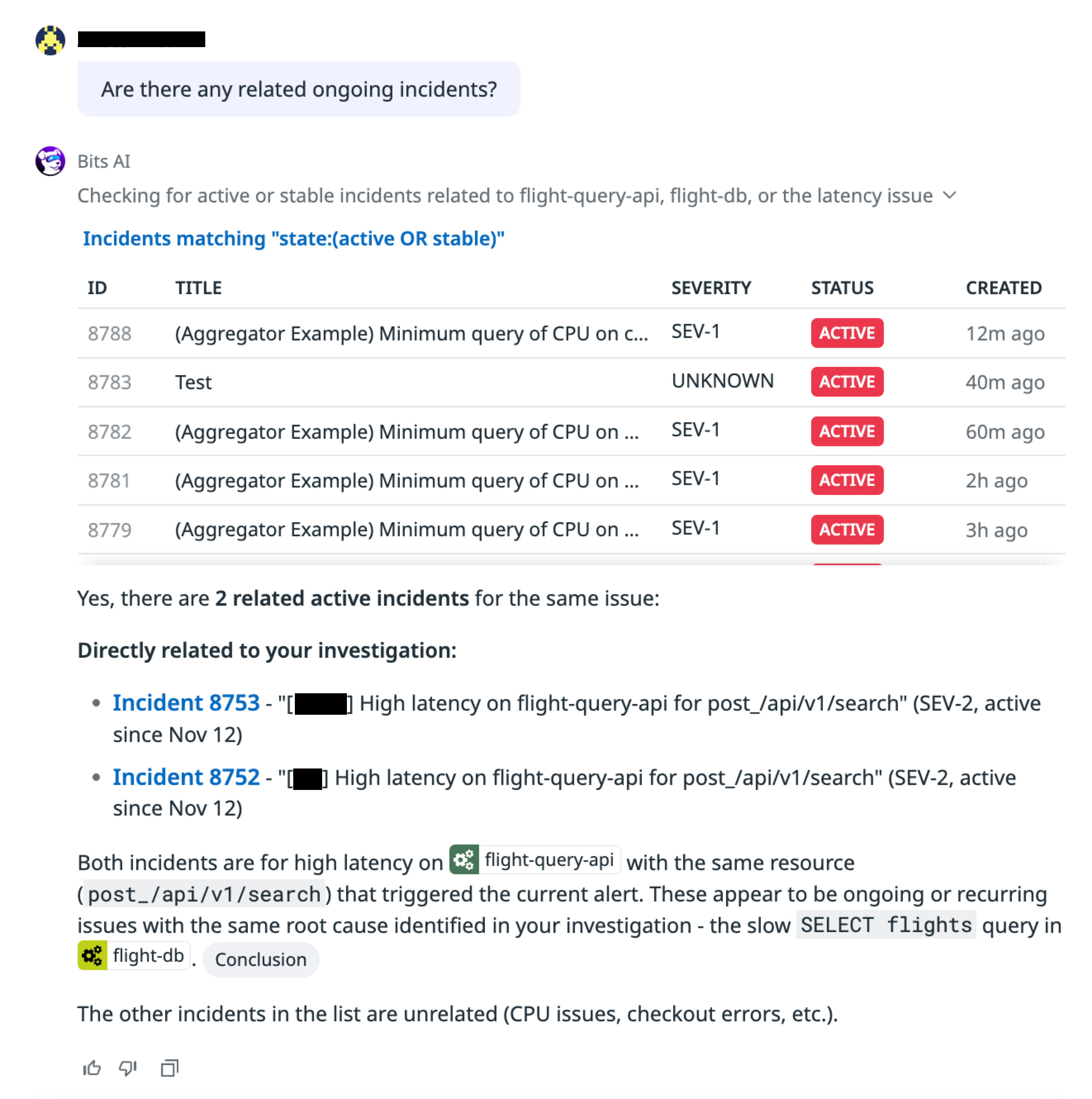 Example chat where a user asks Bits AI about related ongoing incidents, and Bits AI responds with a list of related incidents and an explanation on what makes them related