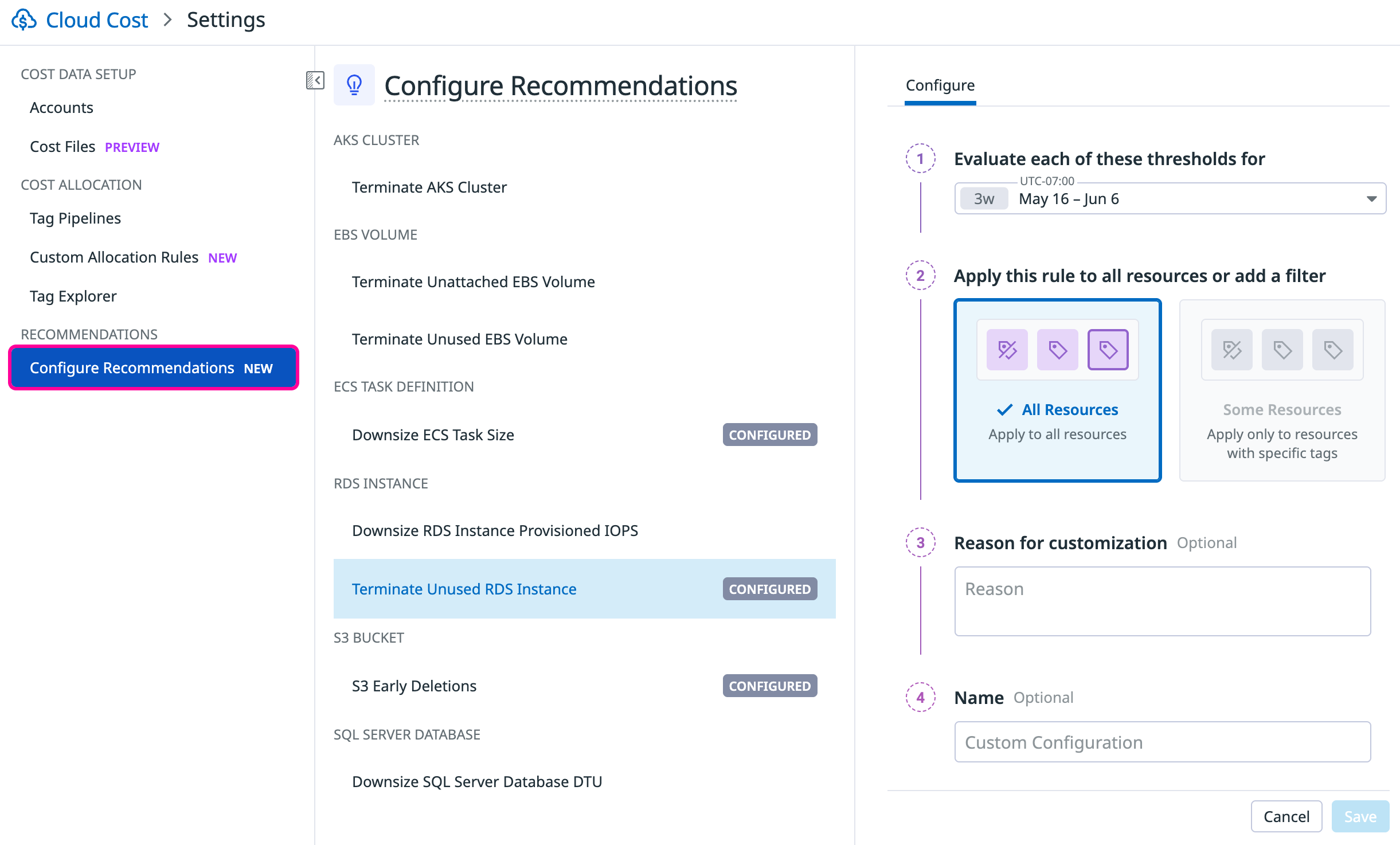 - Navigate to Cloud Cost > Settings > Configure Recommendations.