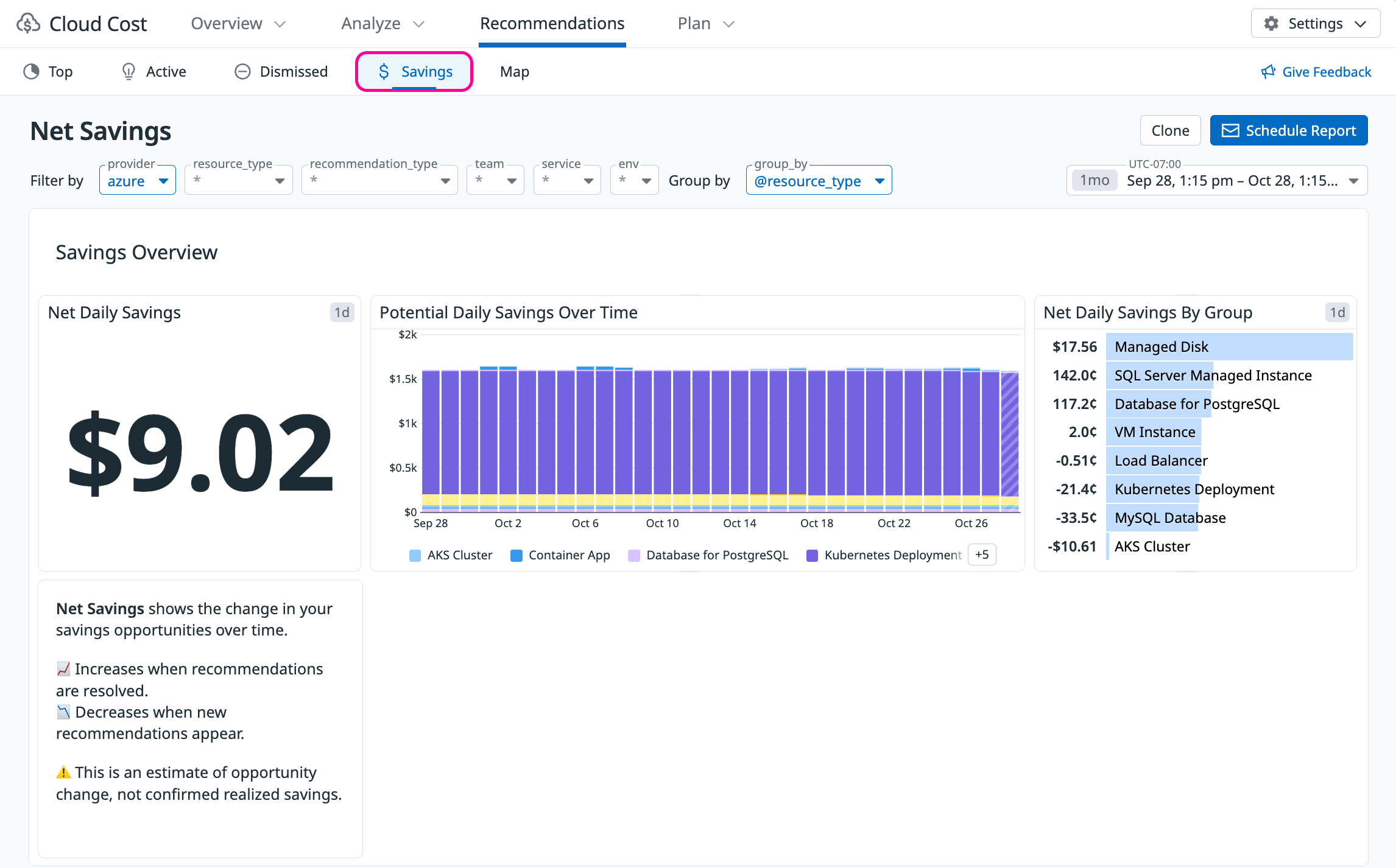 The Savings tab within Recommendations gives you visibility into how your savings opportunities change over time. This information can be useful for tracking cost saving initiatives. The Savings tab visualizes two kinds of savings values: