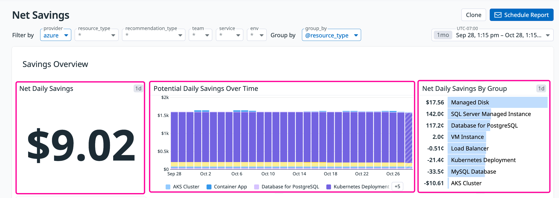 - The Net Daily Savings by Group widget provides more granular visibility into net daily savings, allowing you to group savings by tags of your choice.