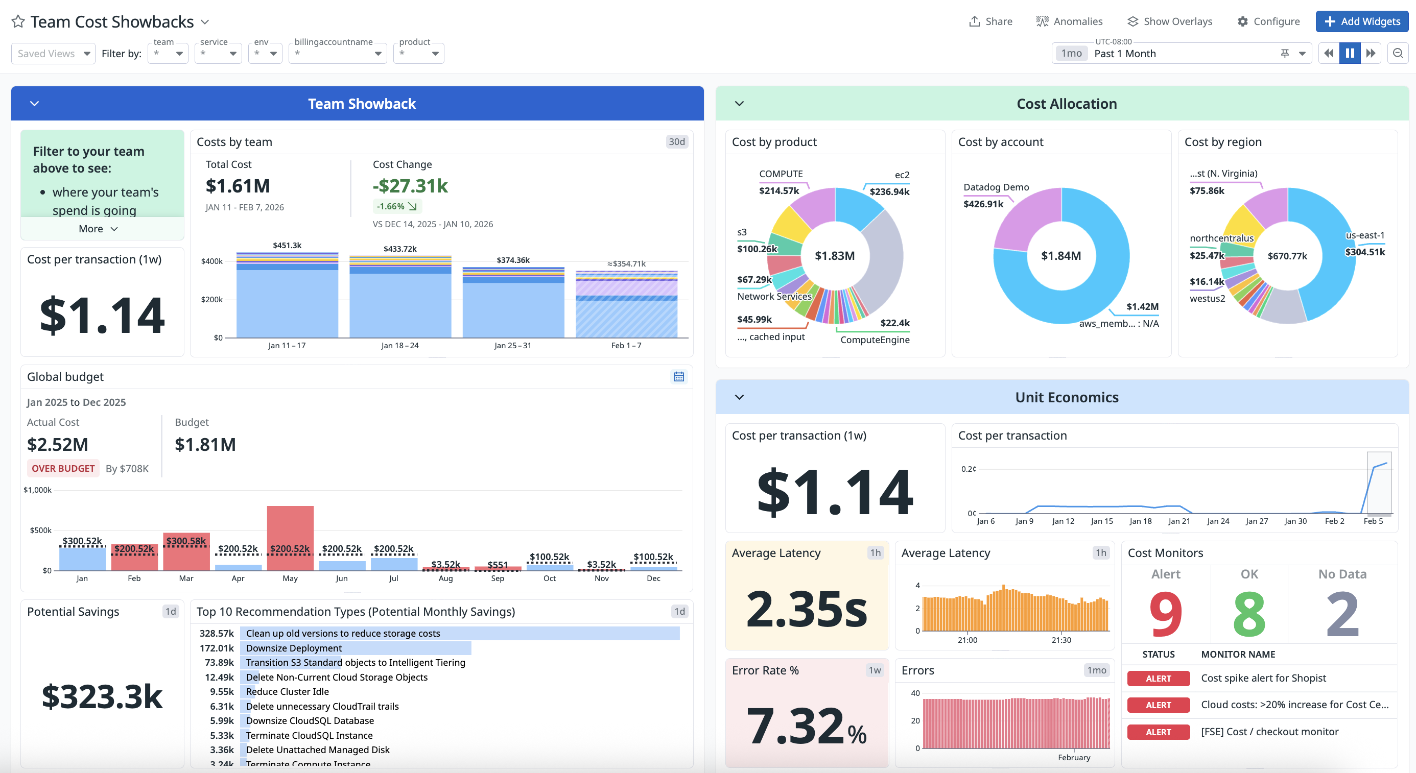 Visualize and monitor your cloud spending on dashboards alongside application performance, infrastructure metrics, and business KPIs in a single unified view. This integration provides a complete picture of how costs relate to system behavior and helps support showback and chargeback initiatives.