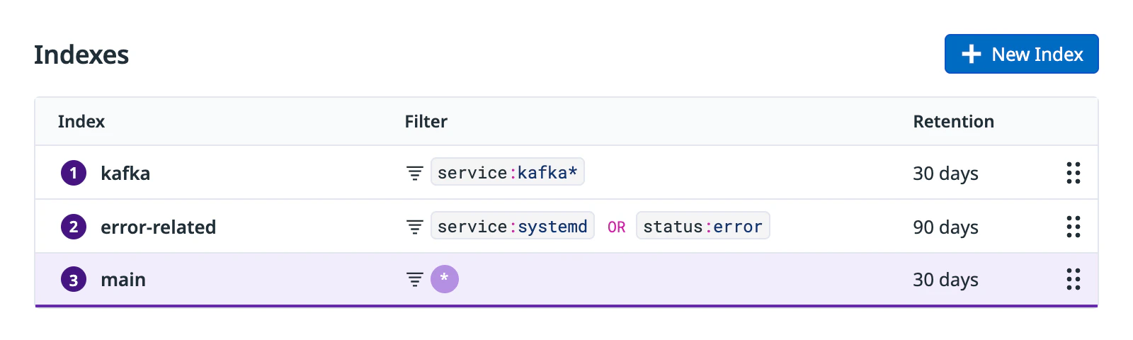 source:security env:production should appear above source:security. - A catch-all index with a