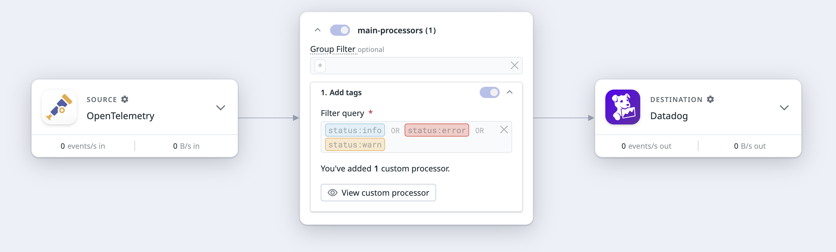 Note: The custom processor adds a ddtags field with custom tags to all logs through the remaps configuration.