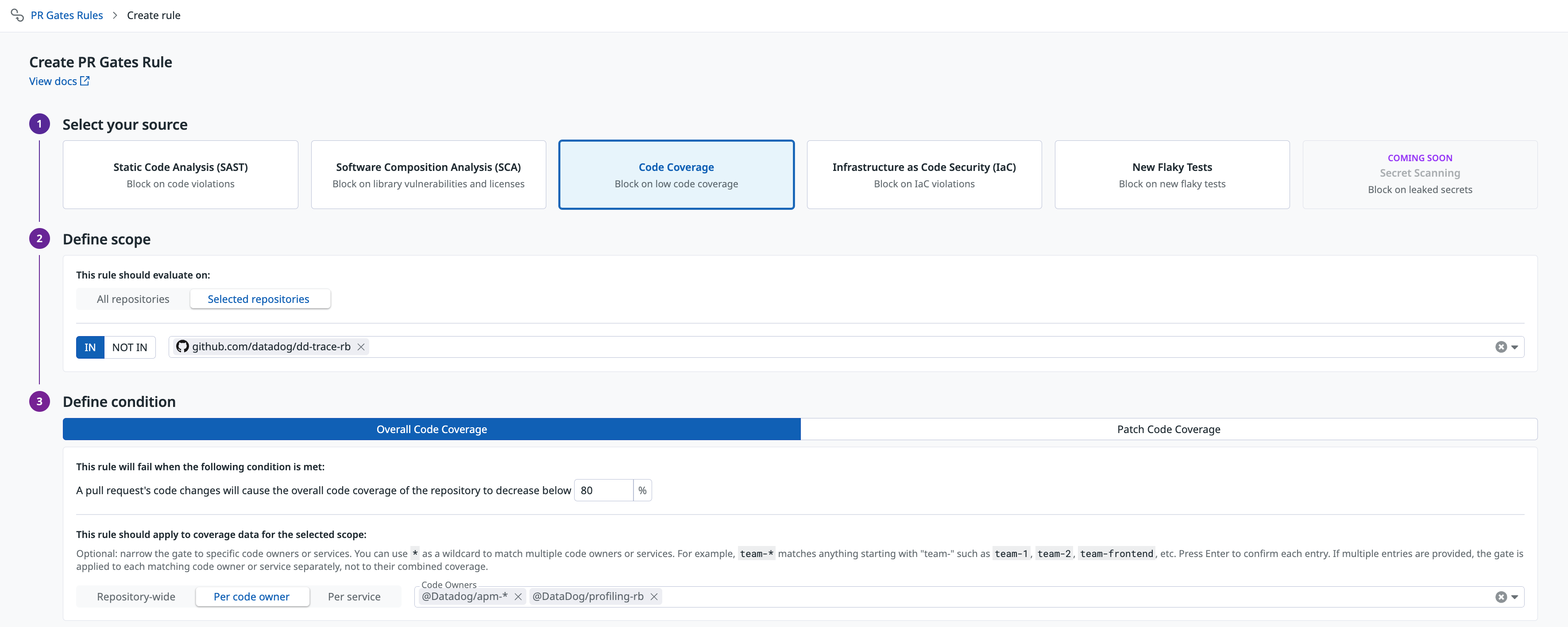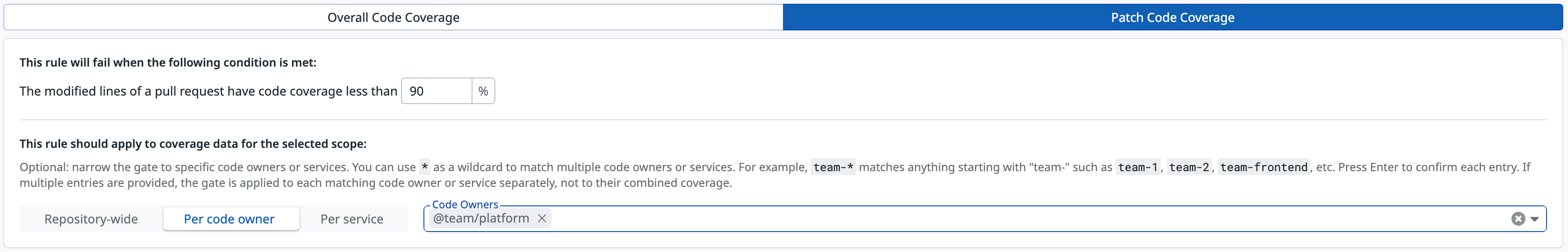• With services or code owners specified: The gate evaluates coverage separately for each selected service or code owner team. When multiple services or code owners are specified, each is evaluated independently against the threshold. The gate does not combine coverage across services or code owners.