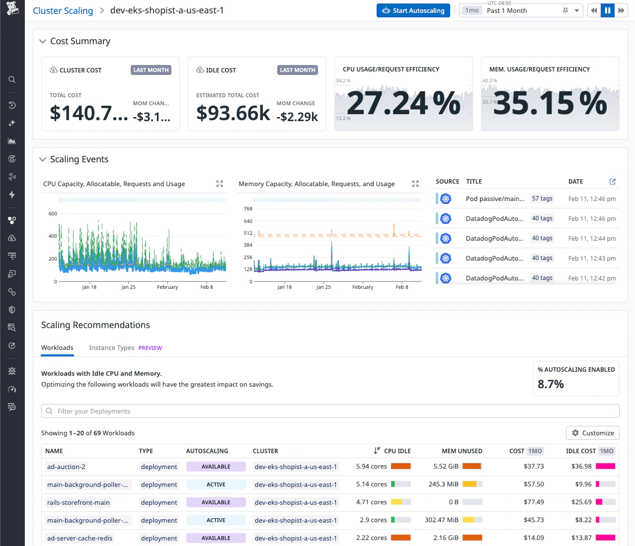 The Cluster Scaling detail page for cluster dev-eks-shopist-a-us-east-1. The Cost Summary section displays four metrics: cluster cost of $140.7k with negative $3.1k month-over-month change, idle cost of $93.66k with negative $2.29k change, CPU usage/request efficiency at 27.24%, and memory usage/request efficiency at 35.15%. The Scaling Events section shows two time-series graphs tracking CPU and memory metrics over the past month, with fluctuating usage patterns, alongside a timeline of recent scaling events including pod and DatadogPodAutoscaler activities. The Scaling Recommendations section displays a table of workloads with idle CPU and memory, showing 8.7% autoscaling enabled.