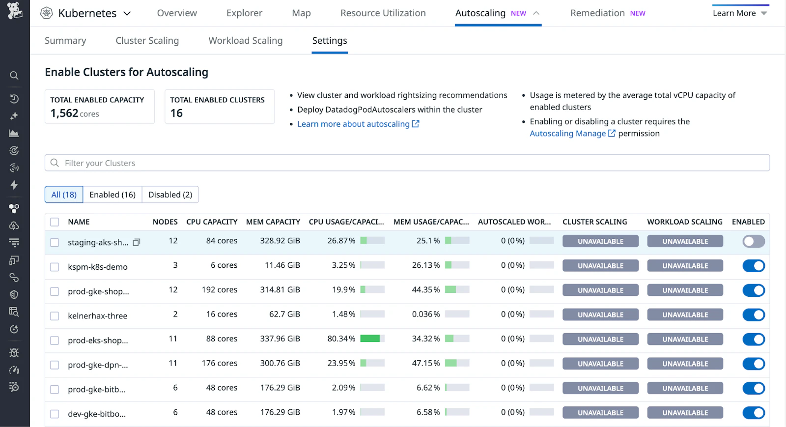 In Datadog, navigate to Kubernetes Autoscaling. You can review all your clusters that are available for autoscaling on the Autoscaling Settings page. Toggle the Enabled column for your cluster of choice.