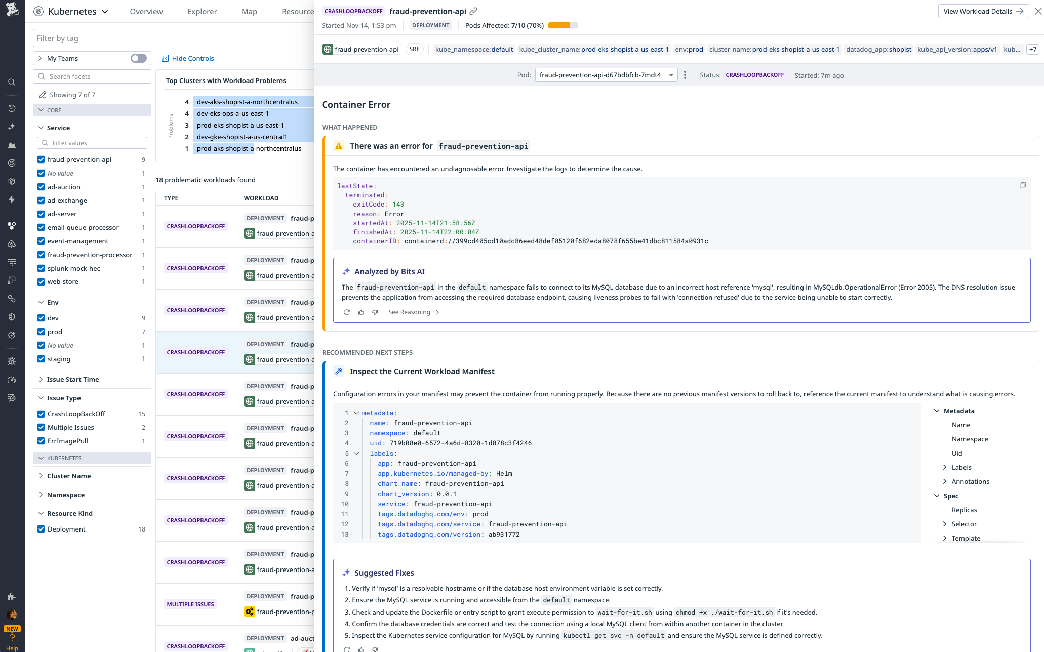 Bits AI Kubernetes Remediation analyzes and fixes Kubernetes errors in your infrastructure.