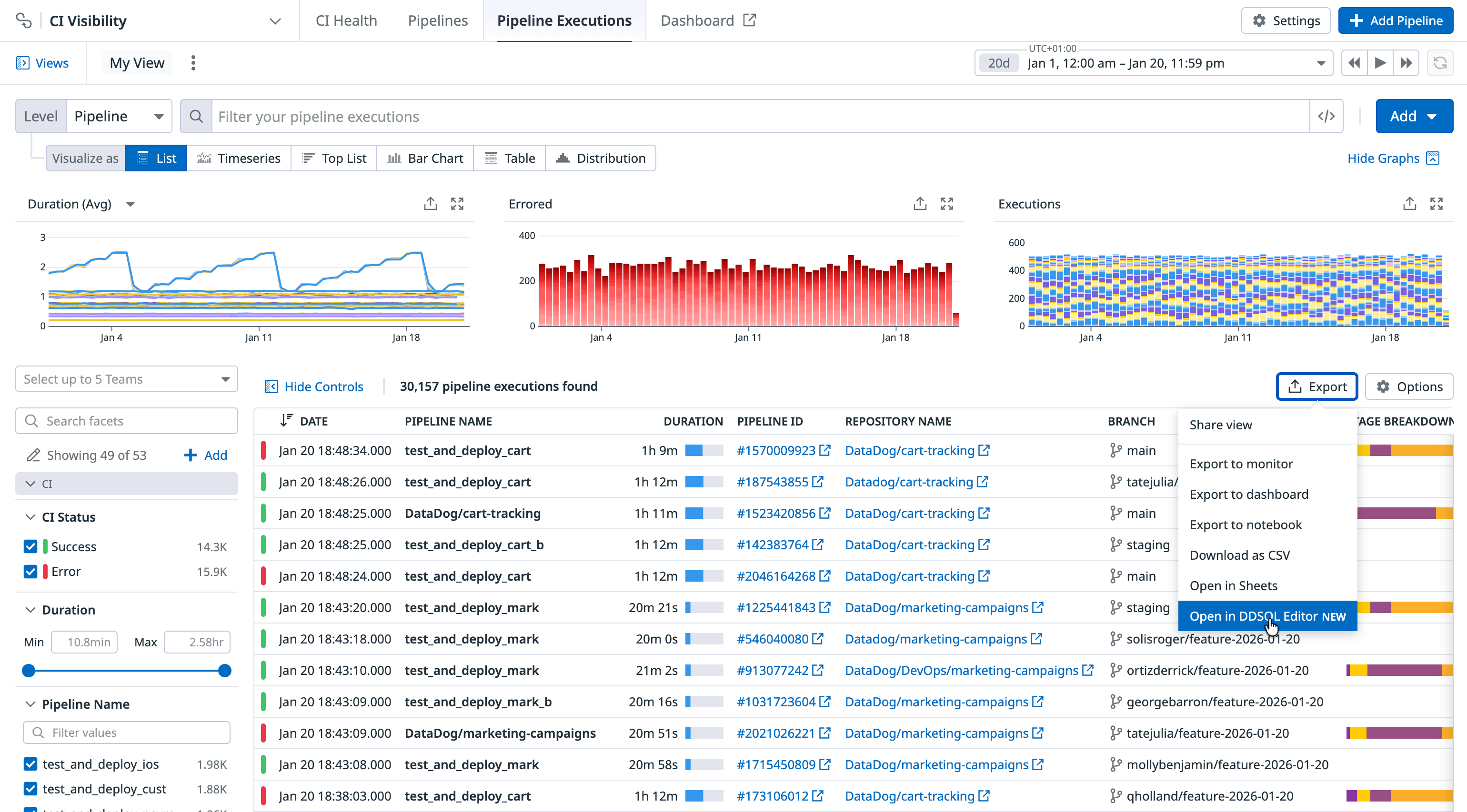 Export your pipelines view in the CI Visibility Explorer