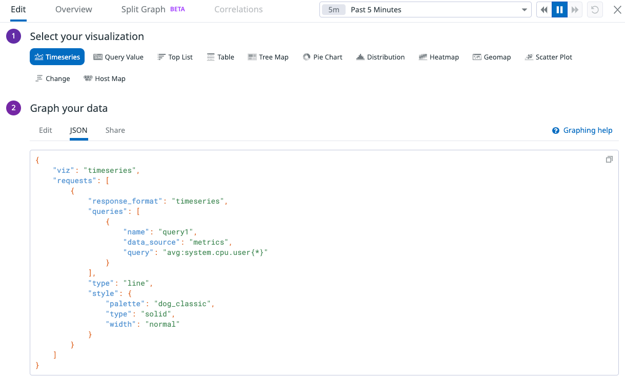 In addition to the GUI graph editor, you can use the JSON editor in your dashboard widgets to configure your visualizations. The schema displayed in the JSON editor mirrors the request body schema of the Dashboard API. For more information on the JSON parameters and required fields see the Dashboard API documentation.
