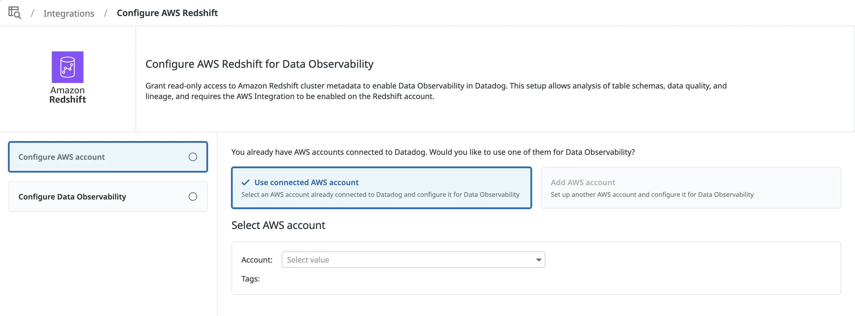 To configure the Redshift integration in Datadog: