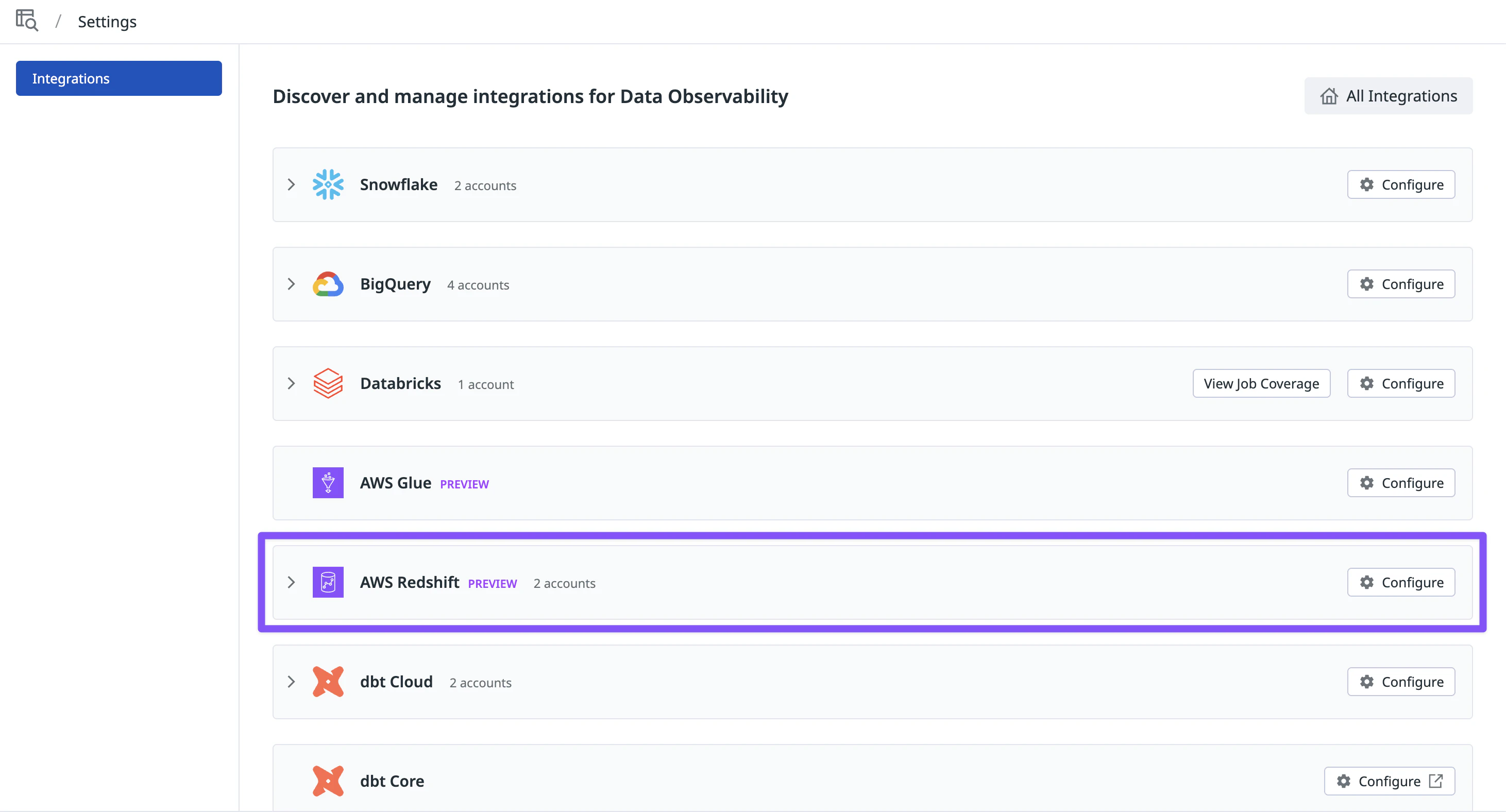 Navigate to Datadog Data Observability > Settings.