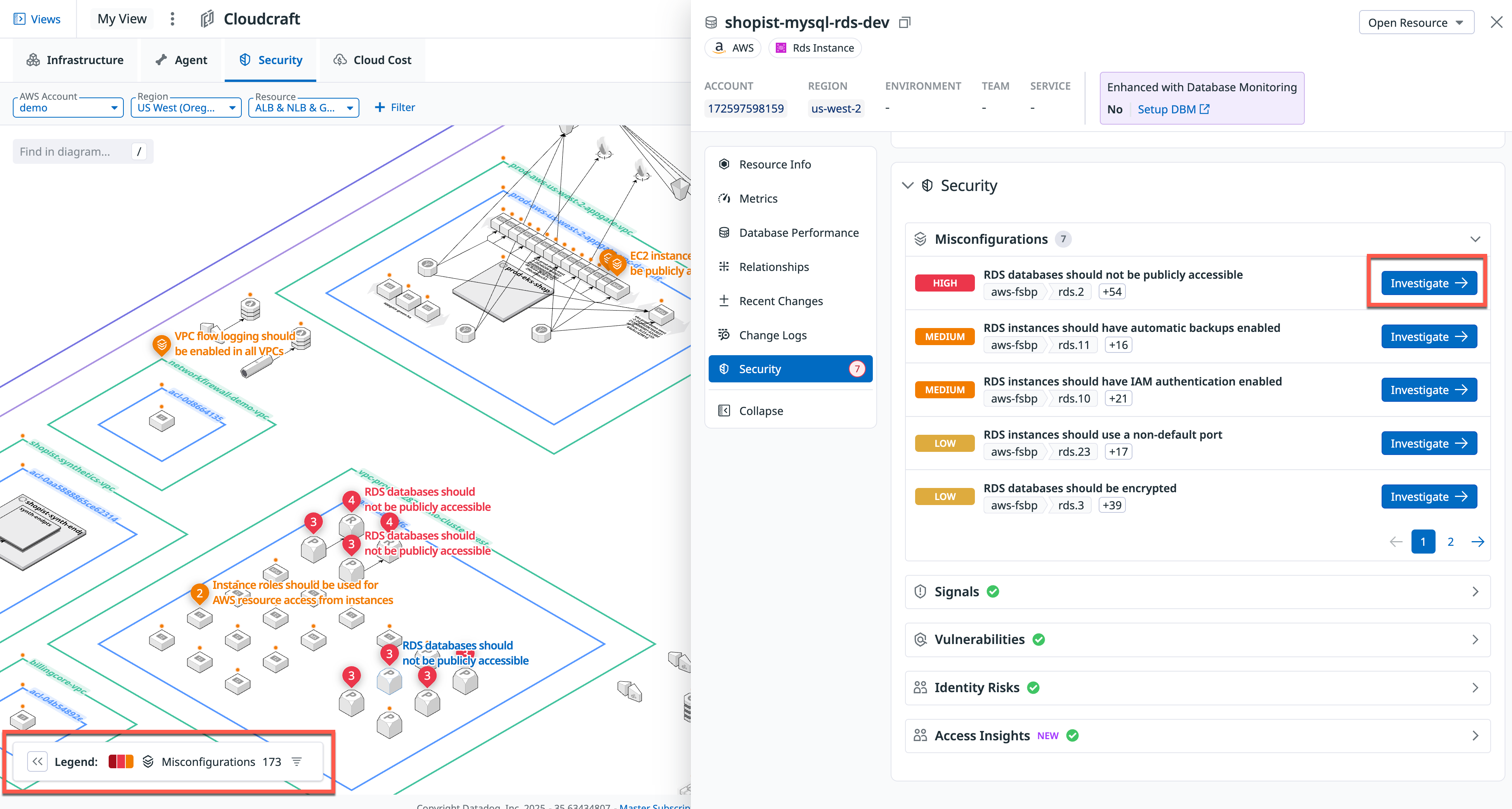 You can click on any resource that has findings to open a side panel with more details, allowing deeper investigation without leaving the diagram. Click Investigate to get more context about the finding and learn how to remediate it.
