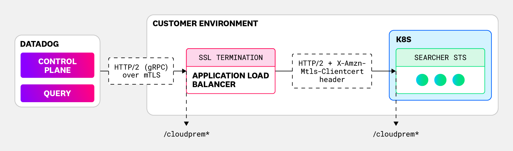 This setup ensures that only authenticated Datadog services can access the CloudPrem cluster while maintaining secure encrypted communication end-to-end.