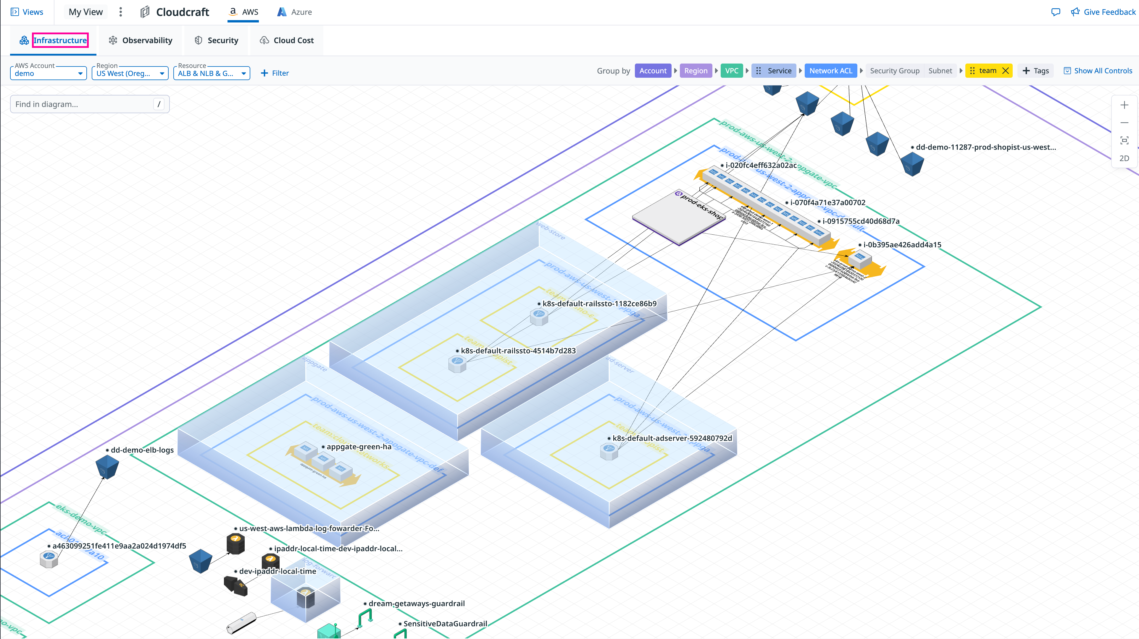 The infrastructure view provides a broad overview, grouping resources by Account, Region, and VPC. This view is ideal for generating architecture diagrams for troubleshooting or high-level review.