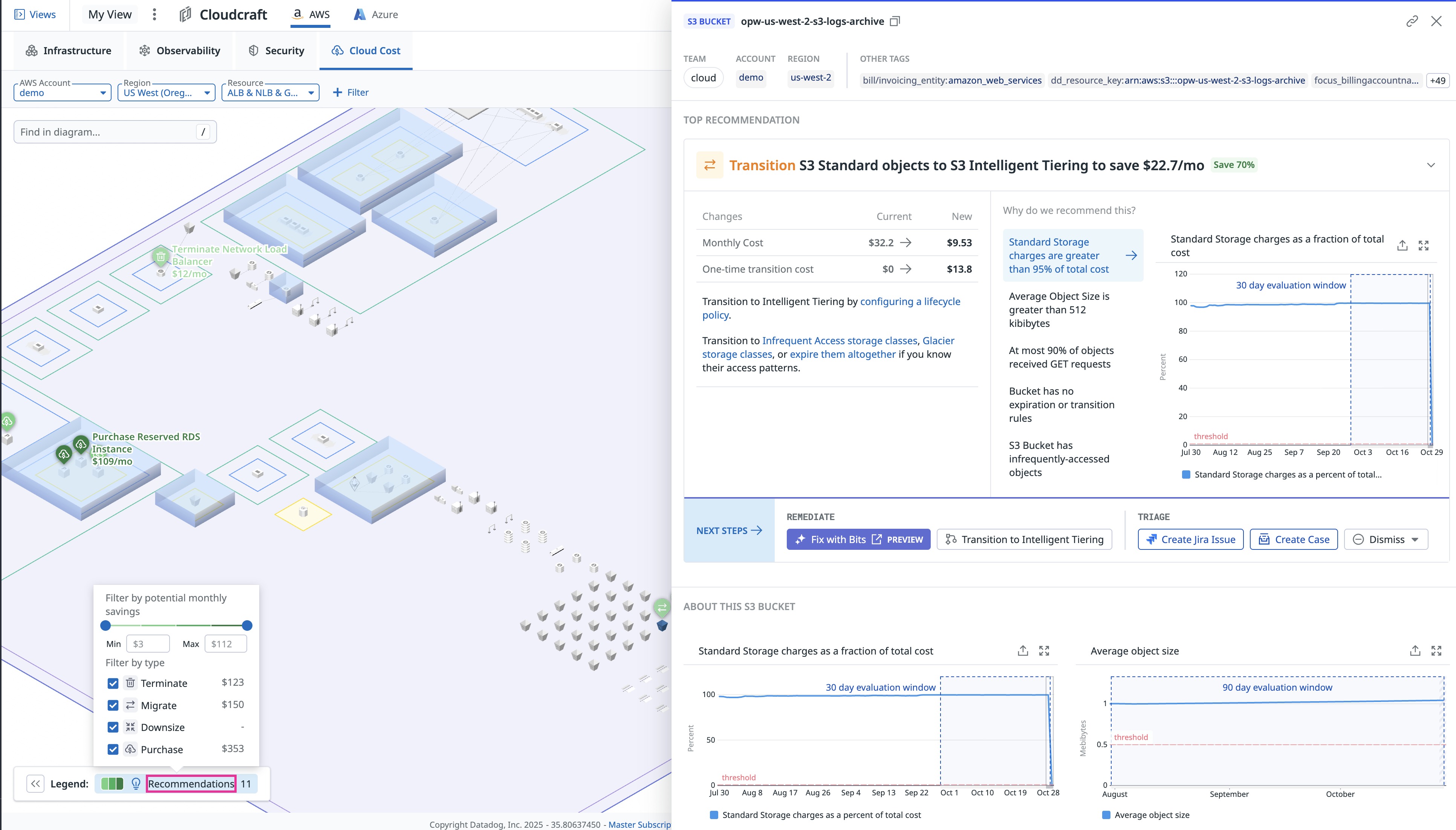 - Recommendations are shown directly on resources with estimated monthly savings (for example, terminate unused RDS instances, migrate storage classes).