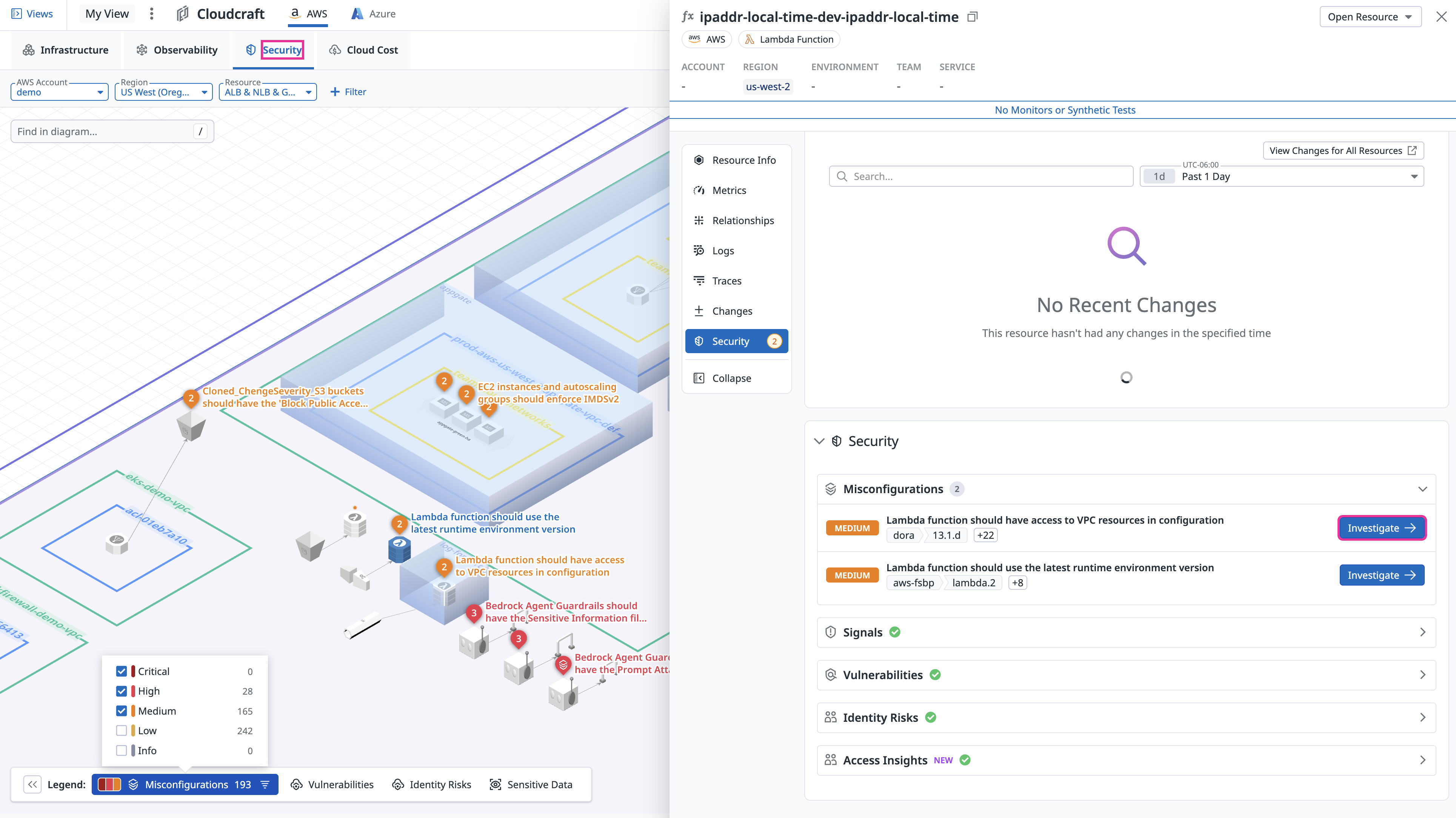By default, the security overlay shows Critical, High, and Medium severity misconfigurations or identity risks, which you can filter in the legend.