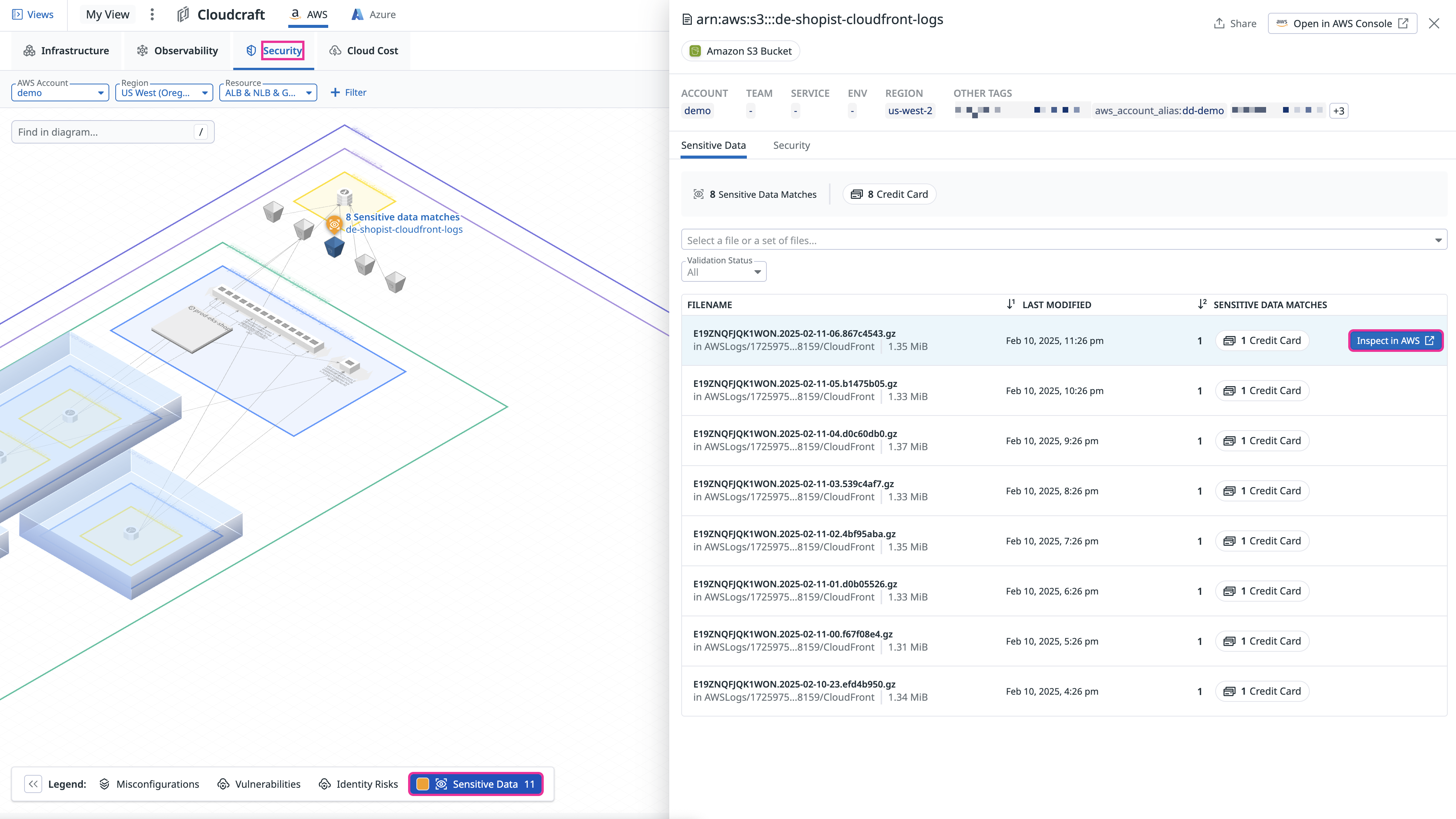 You can view sensitive data matches for your S3 buckets. Click a resource with matches to learn more about the bucket’s sensitive data matches. Then, hover over a filename and click its Inspect in AWS button.