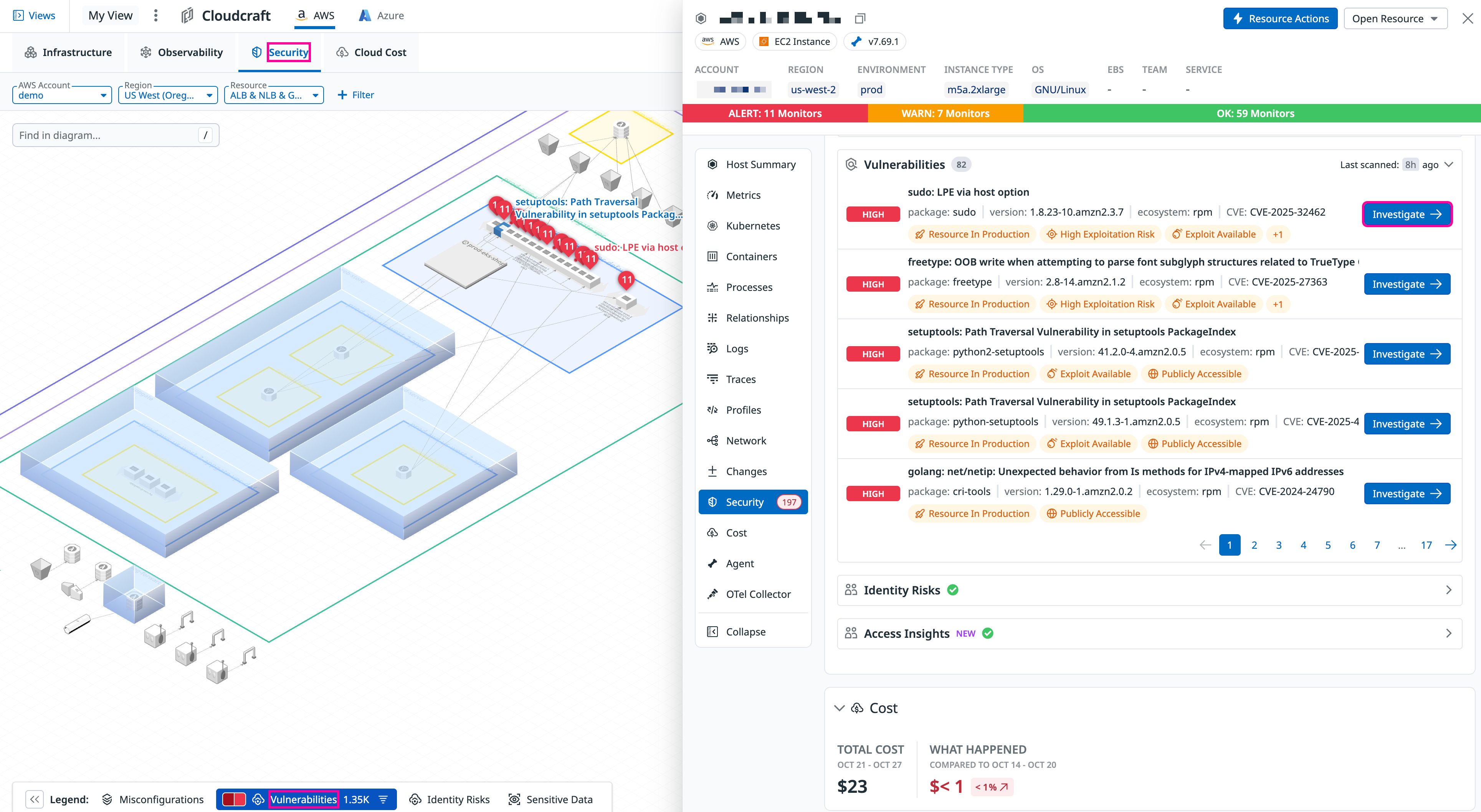 The security overlay highlights potential security exposures in your architecture, grouping resources by Region, VPC, and Security Group. It displays security findings detected by Cloud Security, helping you: