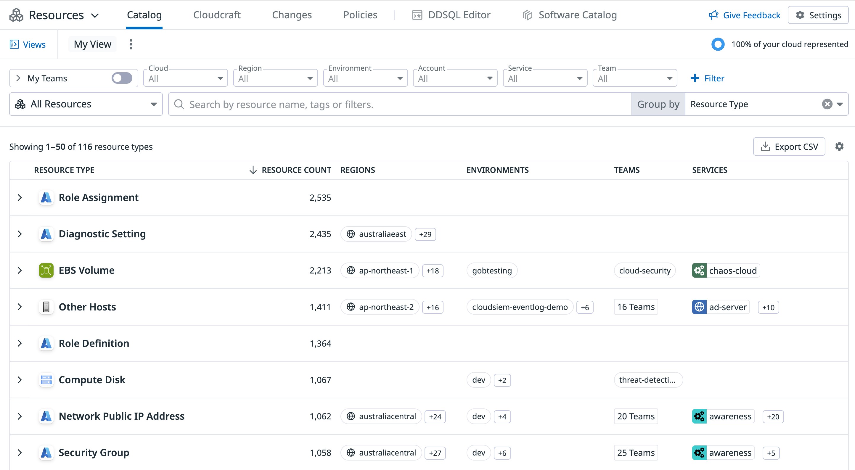Note: If you use Datadog Teams, select the Teams toggle on the left panel, then select the toggle for the teams to which you’re assigned to view only the resources assigned to those teams. In addition, you can export your Resource Catalog list as a CSV file from the top right corner of the list.
