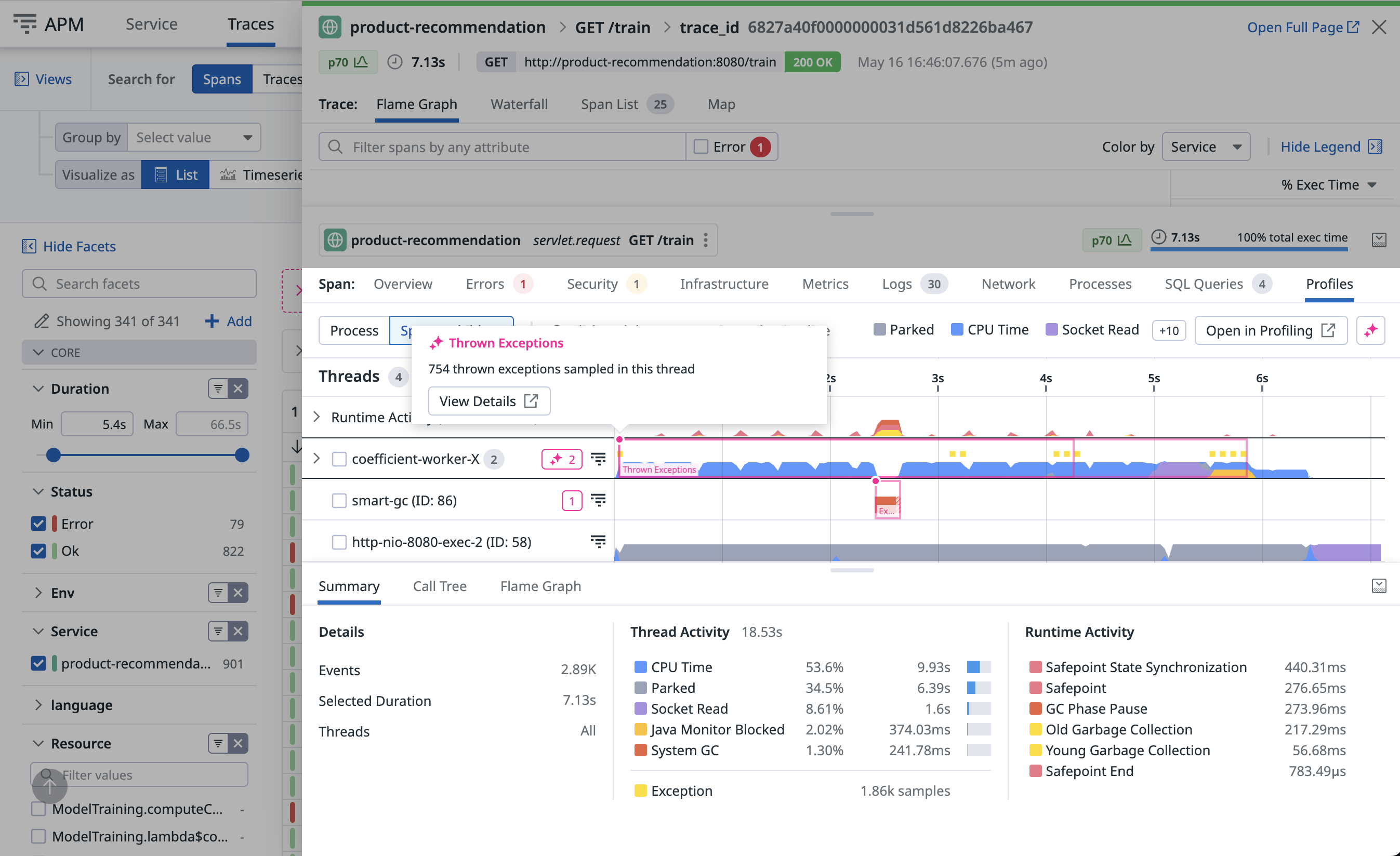 You can move directly from span information to profiling data on the Profiles tab, and find specific lines of code related to performance issues. Similarly, you can also debug slow and resource consuming endpoints directly in the Profiling UI.