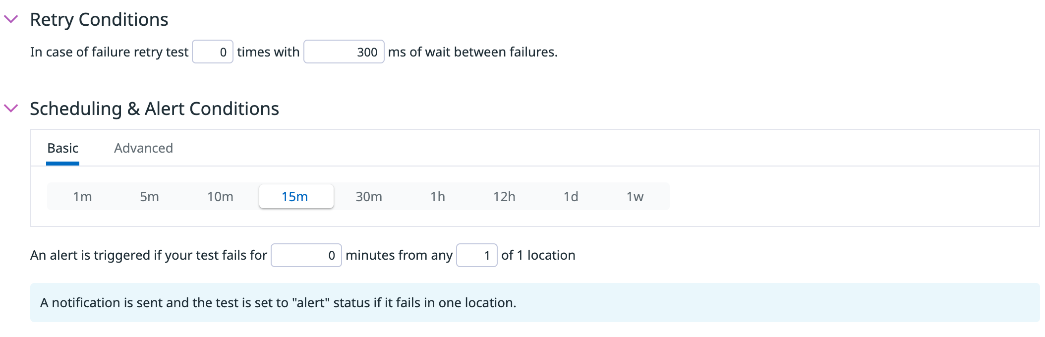 Ajusta la frecuencia de los tests: los intervalos varían de cada cinco minutos a una vez por semana. Para solicitar una frecuencia de un minuto, ponte en contacto con el servicio de asistencia.