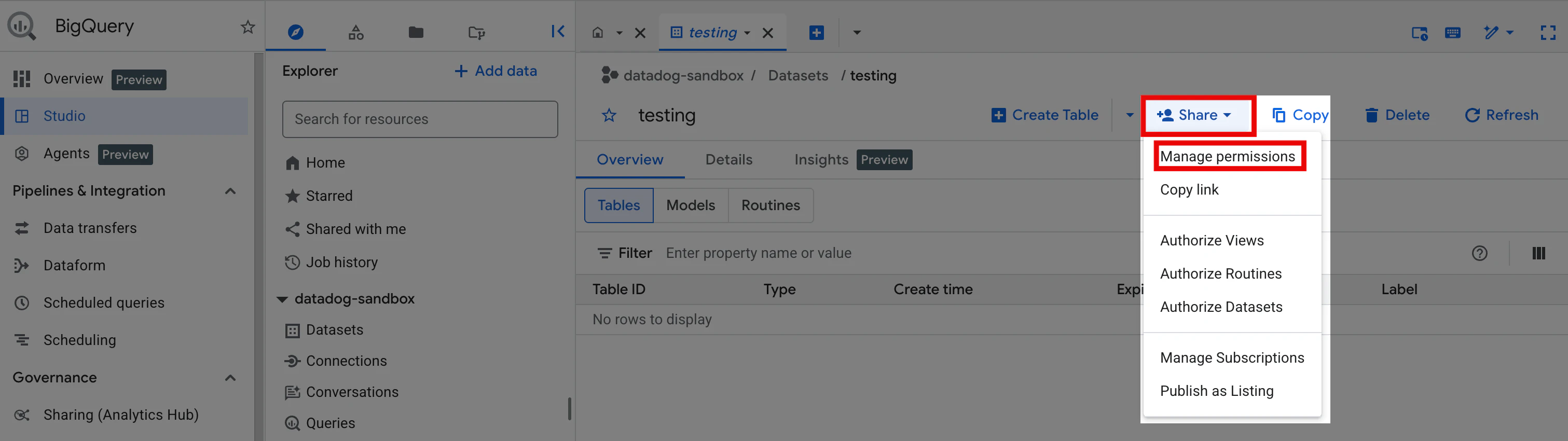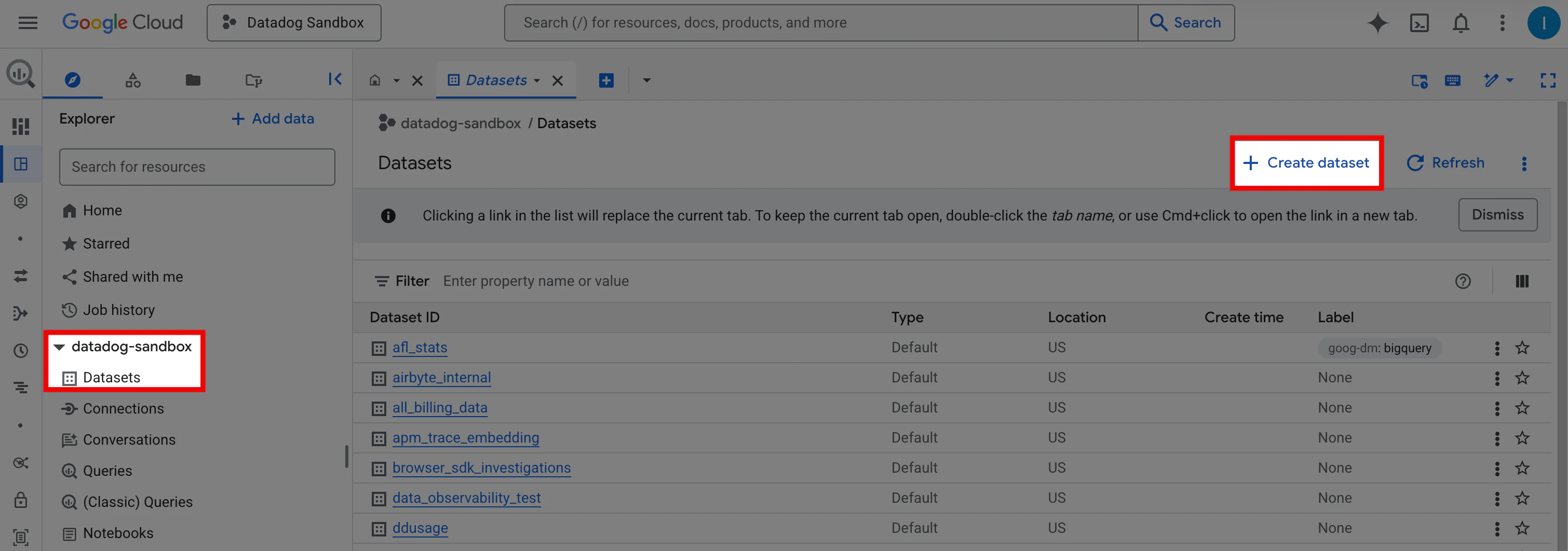 datadog-sandbox). - Click Datasets, then select the dataset containing your source tables.