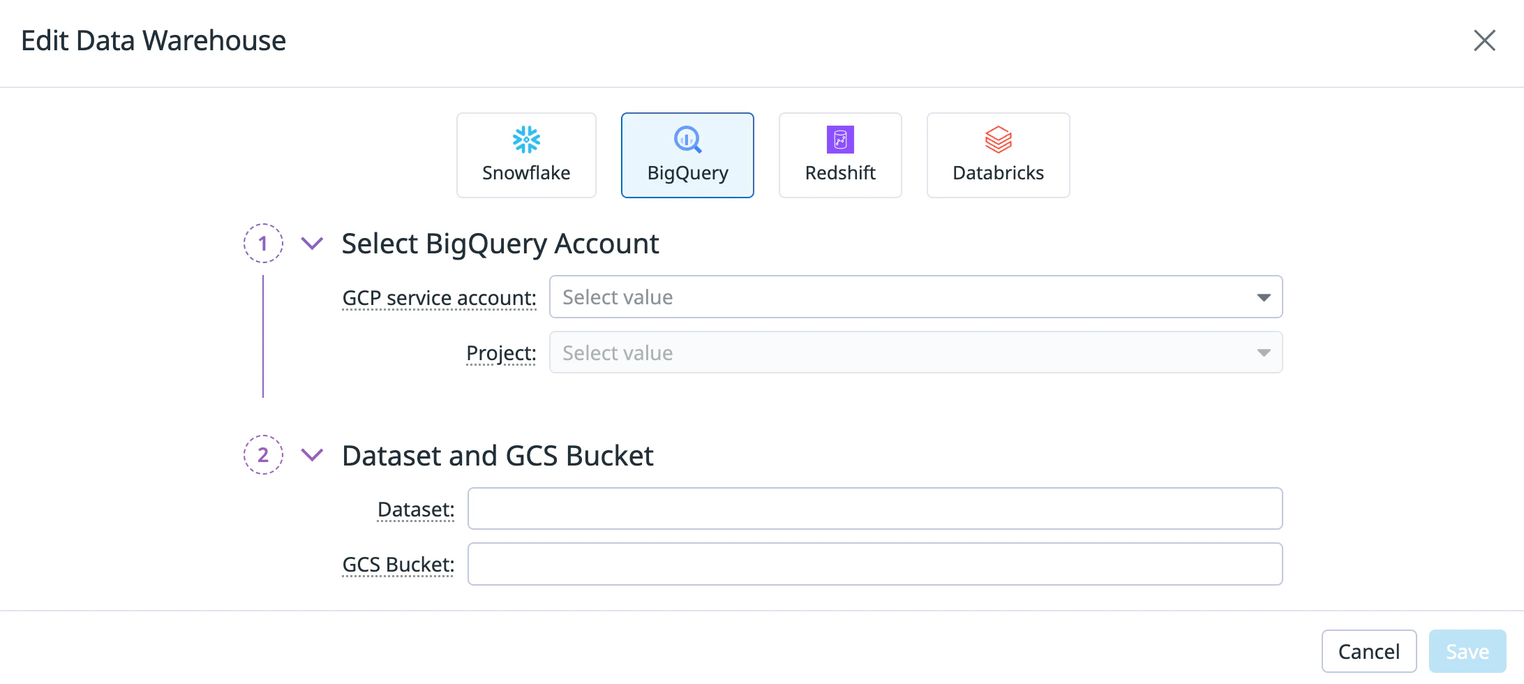 Datadog supports one warehouse connection per organization. Connecting BigQuery replaces any existing warehouse connection (for example, Snowflake).