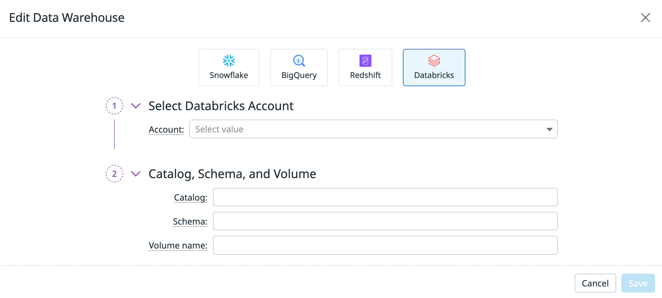 The Edit Data Warehouse modal with Databricks selected, showing input fields for Account, Catalog, Schema, and Volume Name.
