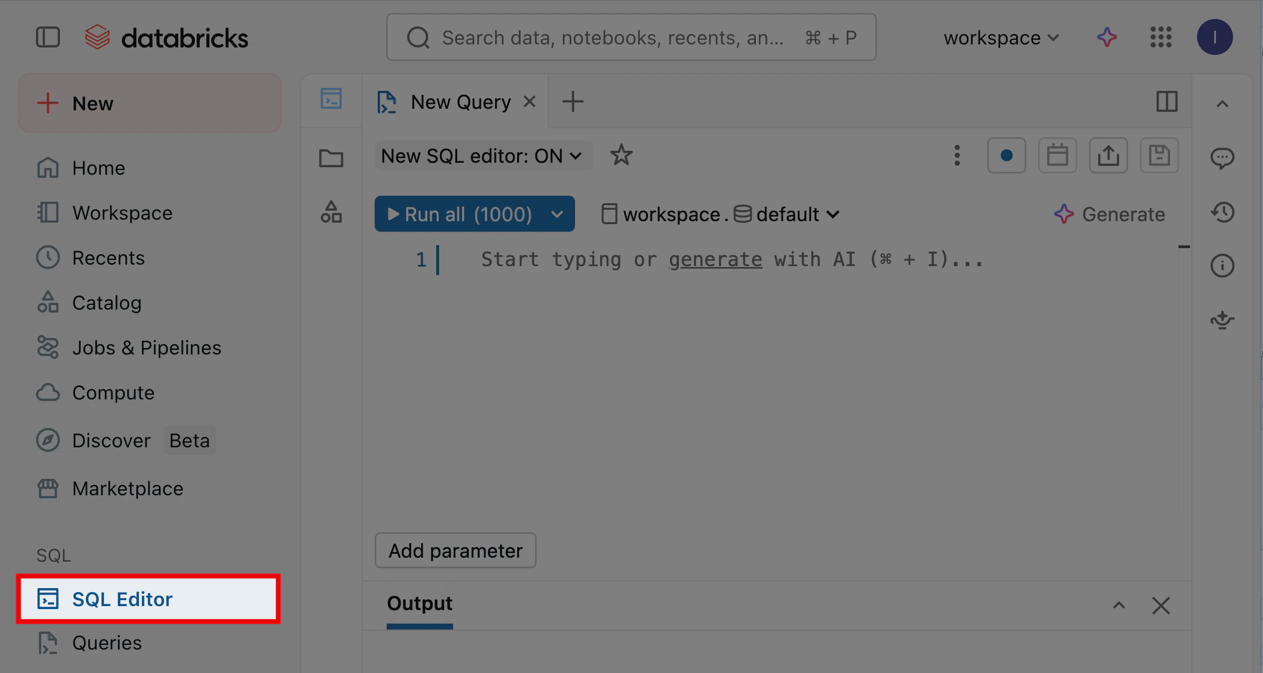 The Databricks Workspace with SQL Editor highlighted in the left navigation under the SQL section, Queries listed below it, a New Query tab open with the New SQL editor: ON toggle at the top, an empty query editor, and a Run all (1000) button with a dropdown arrow.