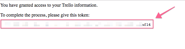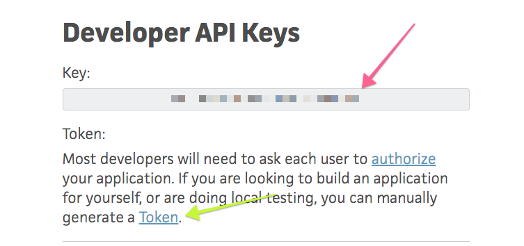 To get the token, click the token link (green arrow) above, authorize a token with the Trello account you are logged into, and grab the token in the subsequent link: