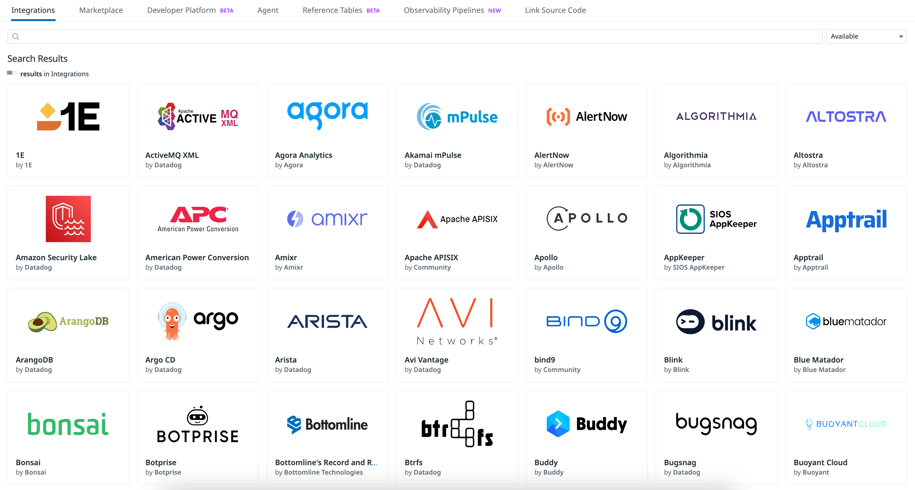 The Integrations page includes integrations built by both Datadog and our Technology Partners, available at no cost to Datadog customers.