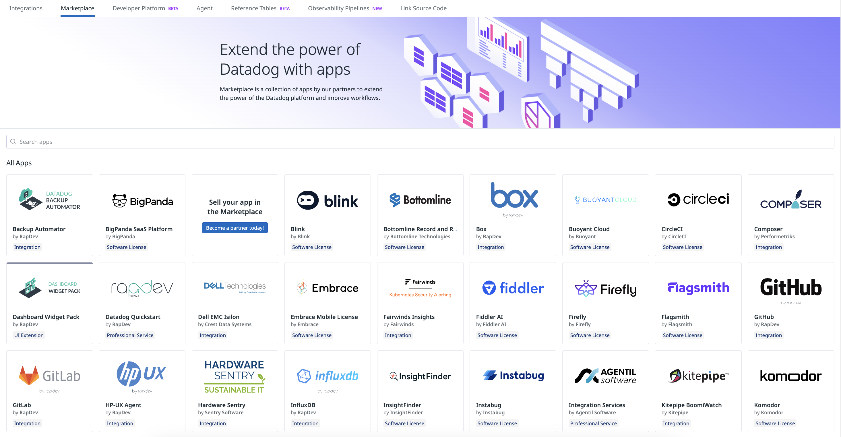 The Marketplace page is a commercial platform for Technology Partners to sell a variety of offerings, including integrations, software licenses, and professional services to Datadog customers.