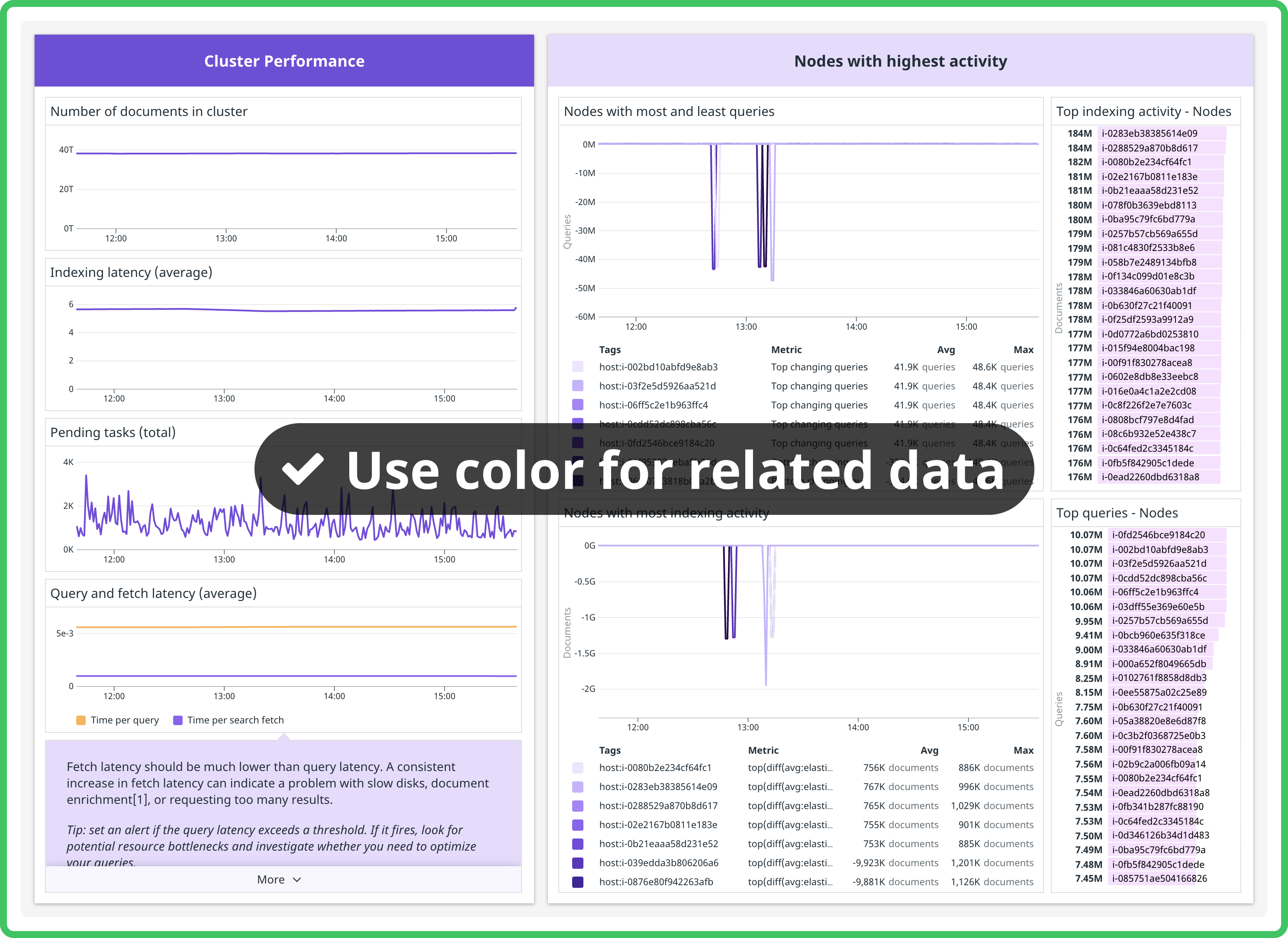 - You can group indexing metrics that reveal which indexes or shards should be optimized in one group, and group resource utilization metrics like disk space or memory usage that inform allocation and redistribution decisions together in a separate group.