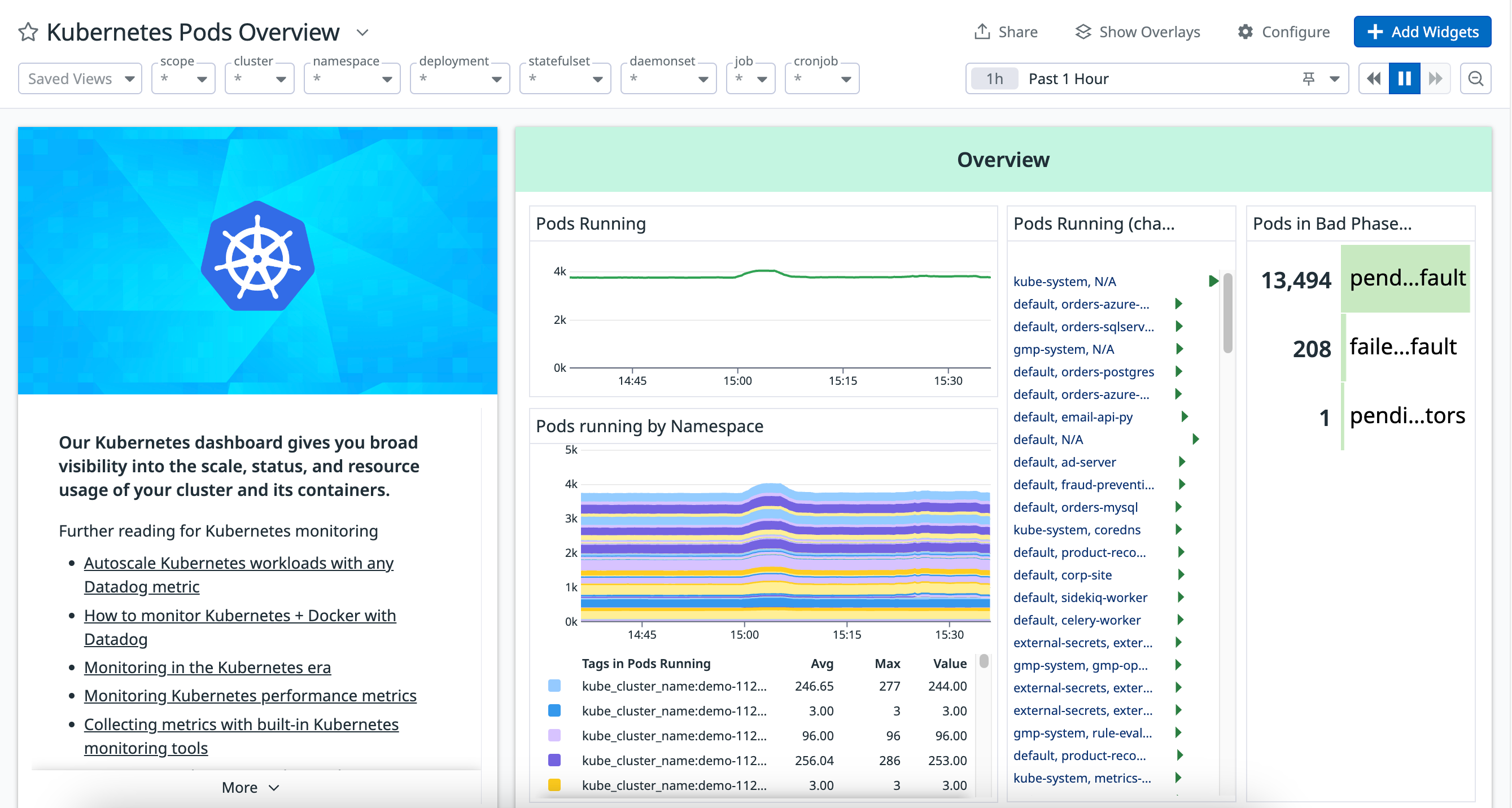 Datadog Dashboards enable you to monitor your infrastructure and integrations by displaying and tracking key metrics. Datadog provides a set of OOTB dashboards for many features and integrations. You can access these by viewing your Dashboard List.