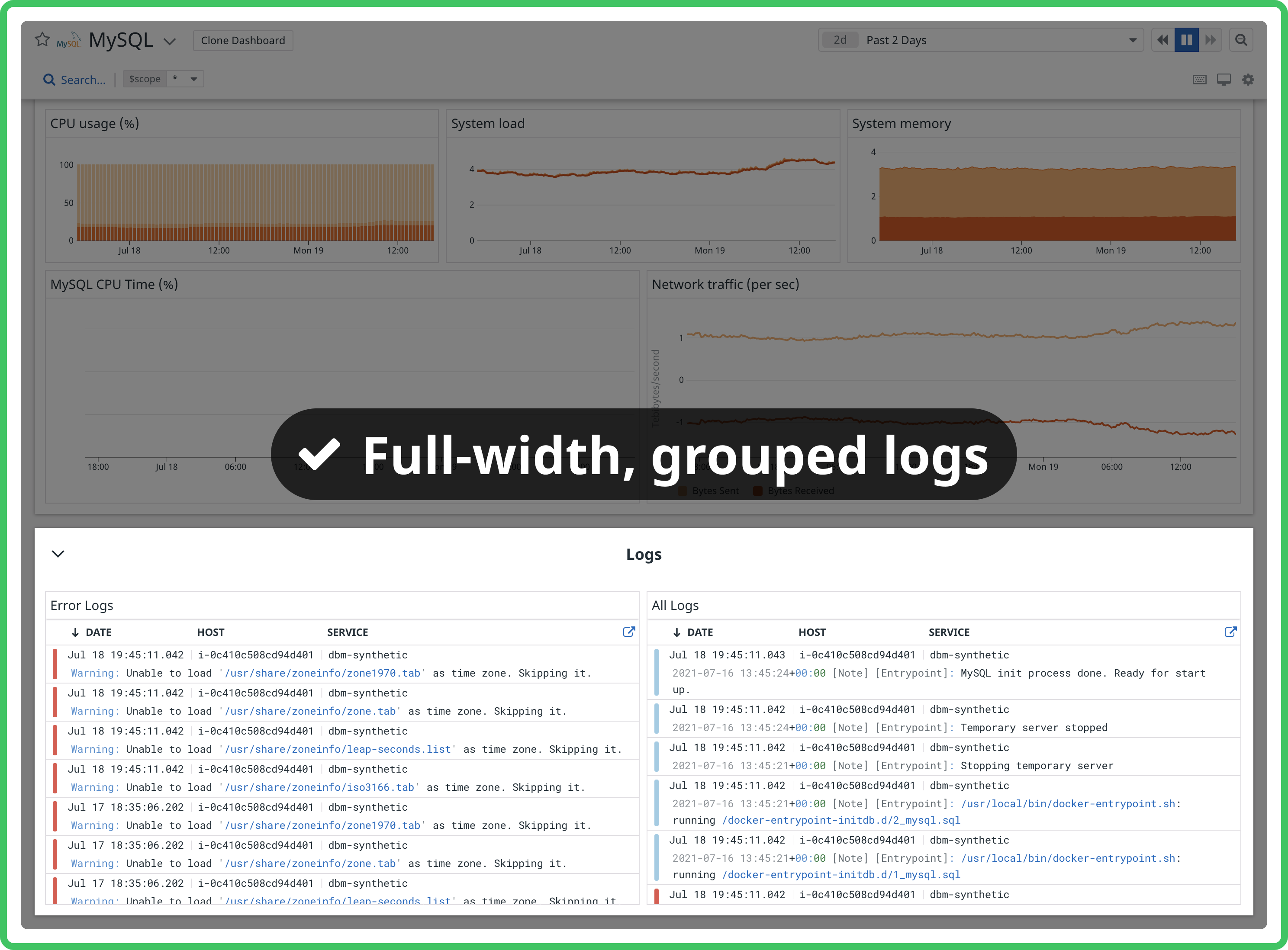 If log collection is enabled for the integration, include a Logs group containing a timeseries widget showing a bar graph of logs by status over time and a log stream of logs with the Error or Critical status. Note: Consider turning groups into powerpacks if they appear repeatedly in dashboards regardless of the integration type so you can insert the entire group with the correct formatting with a few clicks rather than adding the same widgets from scratch each time.
