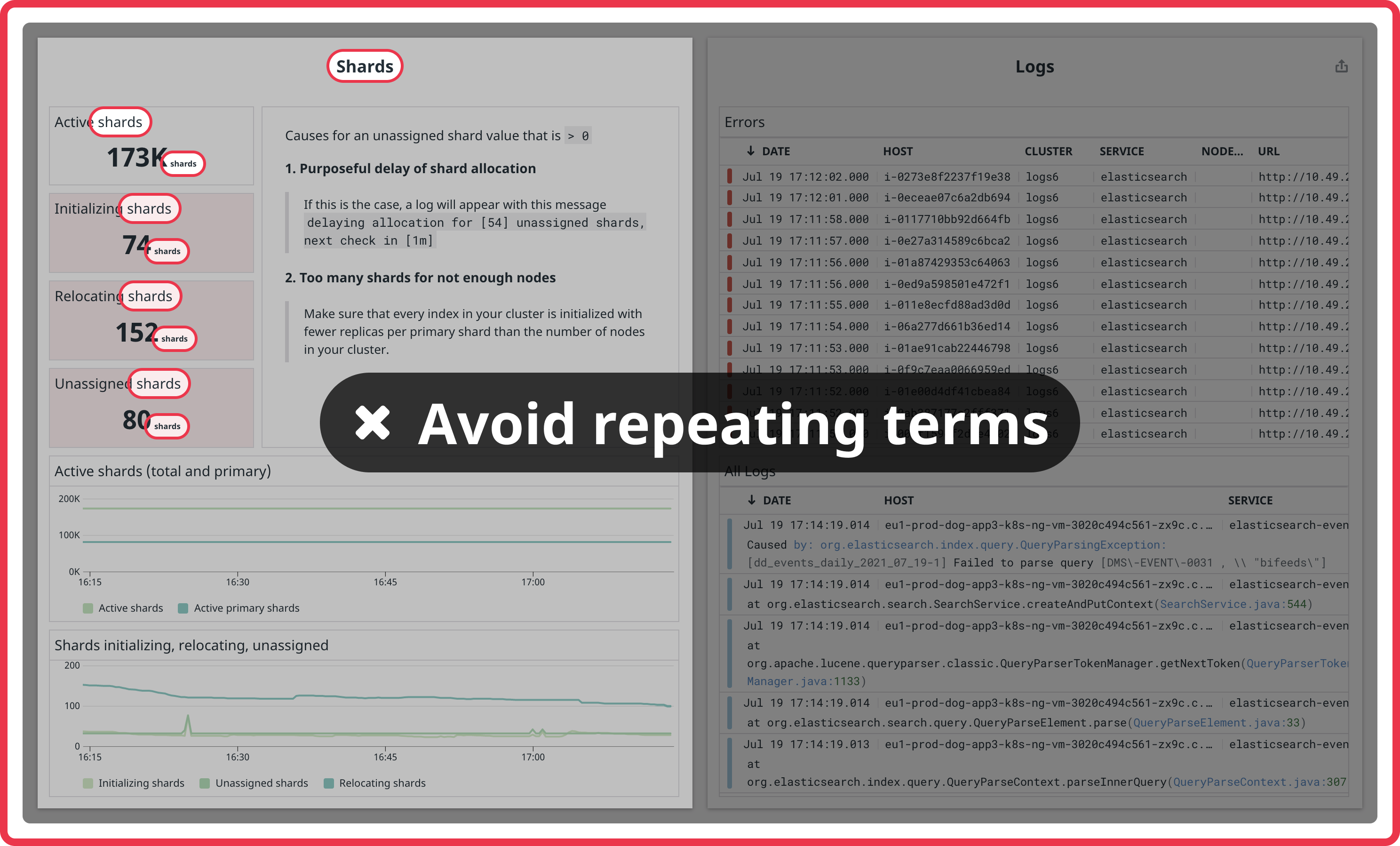 Avoid repeating the group title or integration name in every widget in a group, especially if the widgets are query values with a custom unit of the same name. In this example, note the word “shards” in each widget title in the group named “Shards”.