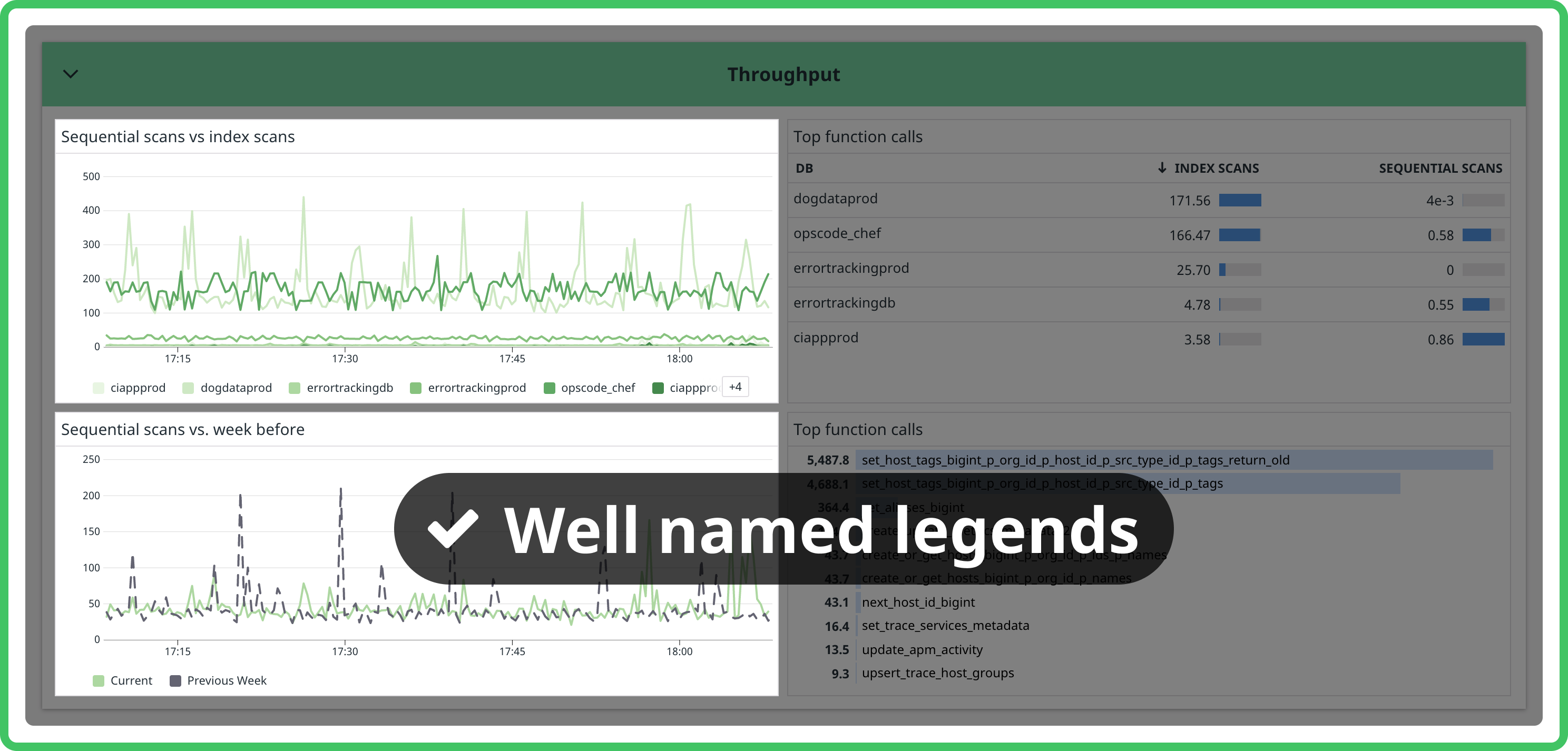 Use legends when they make sense. Legends make it easy to read a graph without having to hover over each series or maximize the widget. Make sure you use timeseries aliases so the legend is easy to read. Automatic mode for legends is a great option that hides legends when space is tight and shows them when there’s room.