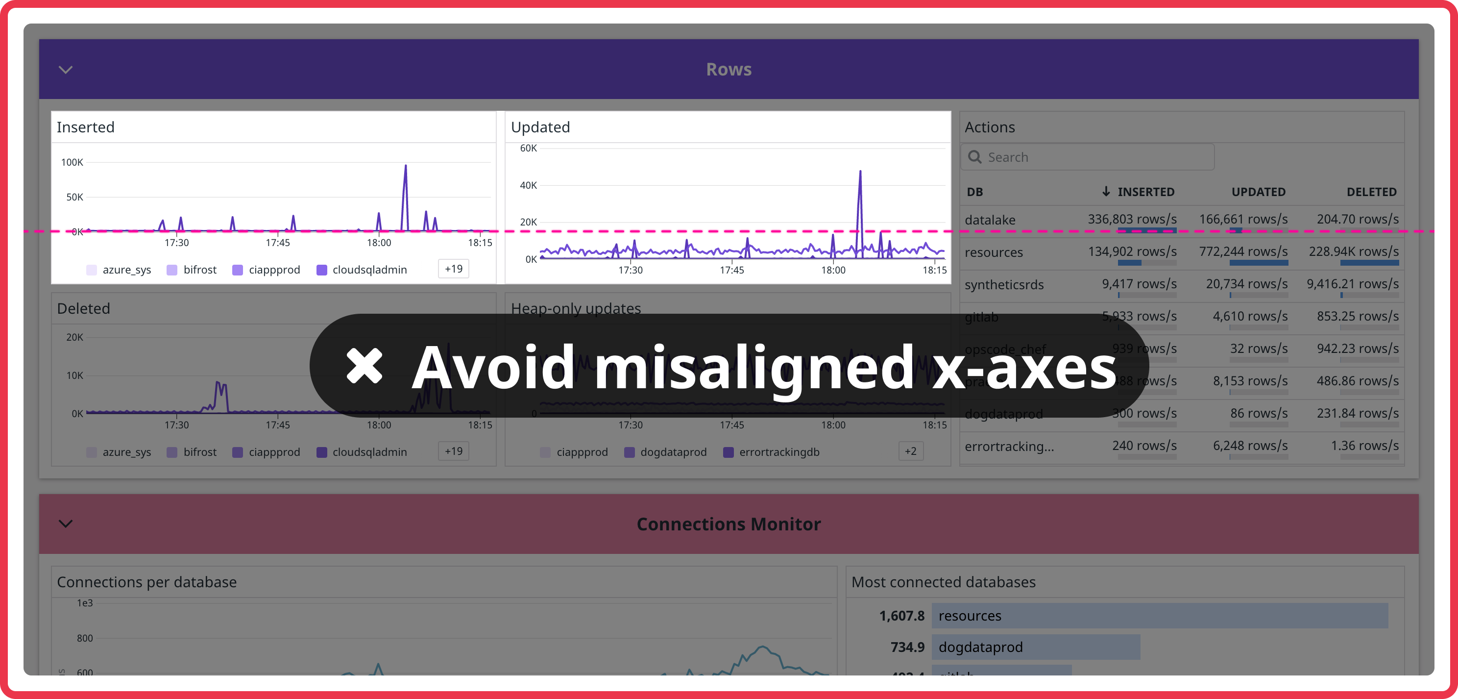If you want users to compare two graphs side-by-side, make sure their x-axes align. If one graph is showing a legend and the other isn’t, the x-axes won’t align. Make sure they both show a legend or both do not.
