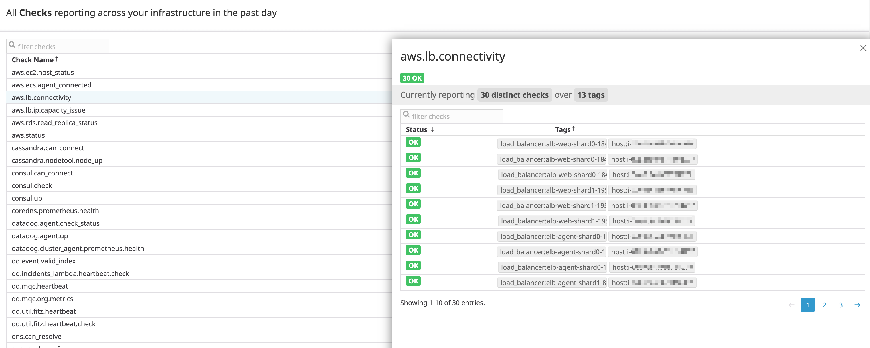 The Check Summary page lists all checks reported across your infrastructure in the past day. Select a check to get insights on the status and tags associated with the check.