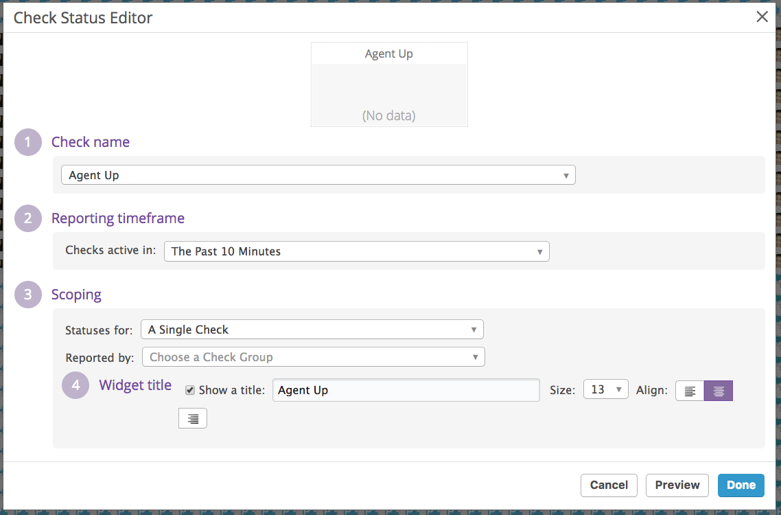 - Scoping: Select a single check or a cluster of check statuses reported by a single tag value or a tag key.