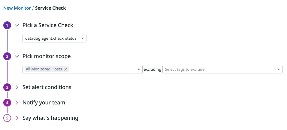 For more information on creating a service check, see Service Check Monitor.