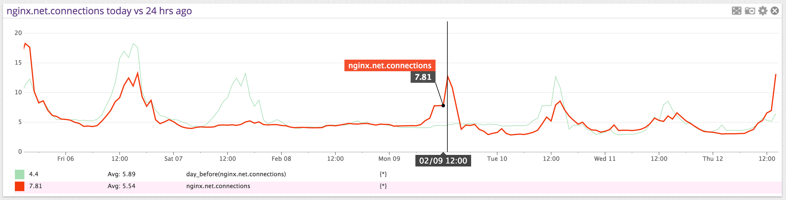 Voici un exemple de nginx.net.connections avec la valeur day_before() représentée par une ligne plus fine. Cet exemple inclut une semaine de données, ce qui permet d’identifier facilement les données de day_before().