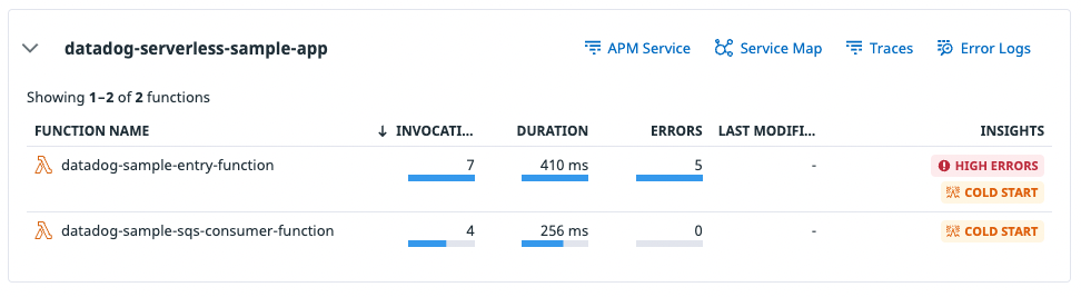 Si vous avez appelé votre prototype d’application au moins une fois, les fonctions datadog-sample-entry-function et datadog-sample-sqs-consumer-function seront affichées :