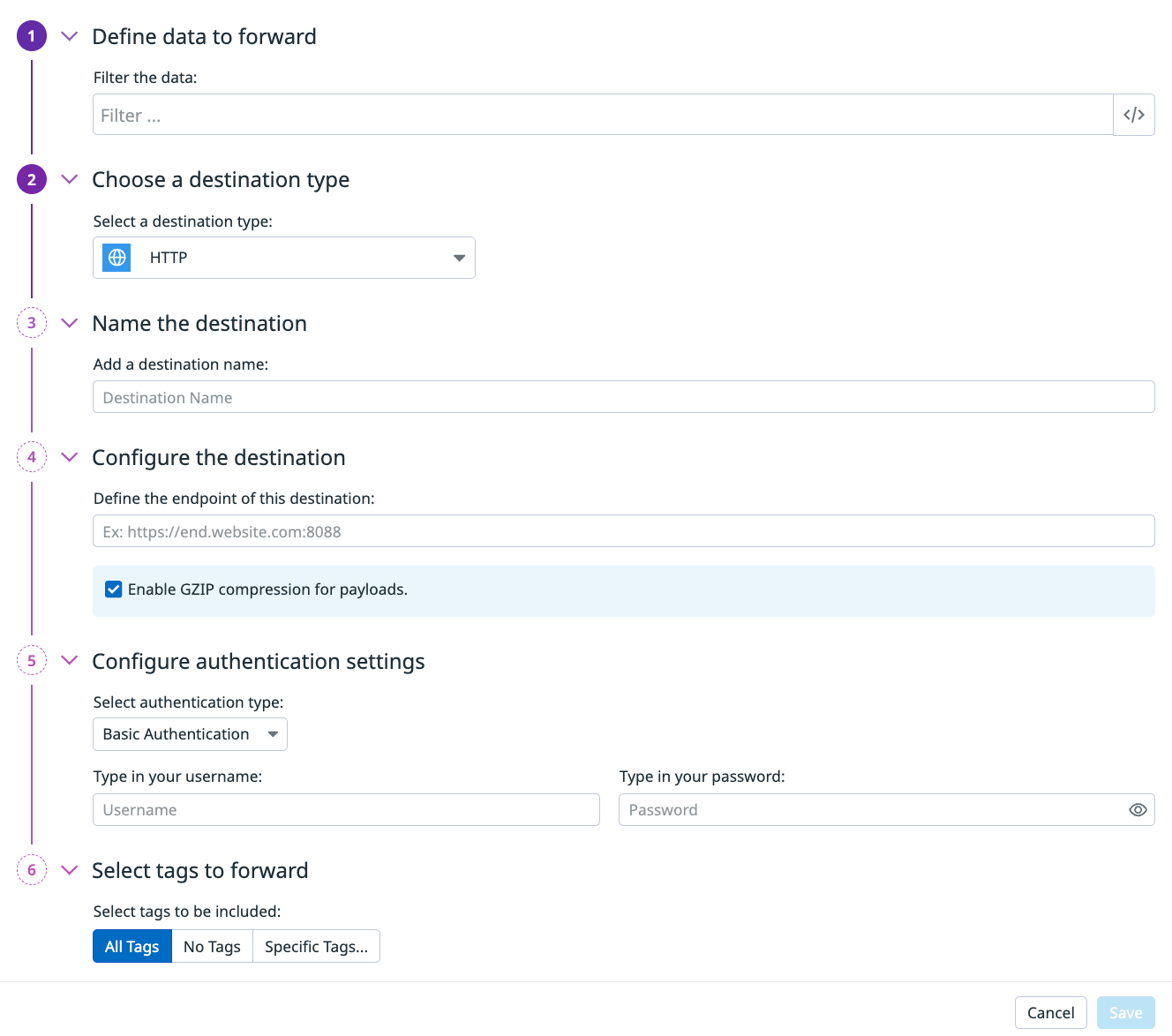 For example, if you want to send logs to Sumo Logic, follow their Configure HTTP Source for Logs and Metrics documentation to get the HTTP Source Address URL to send data to their collector. Enter the HTTP Source Address URL in the Define endpoint field.