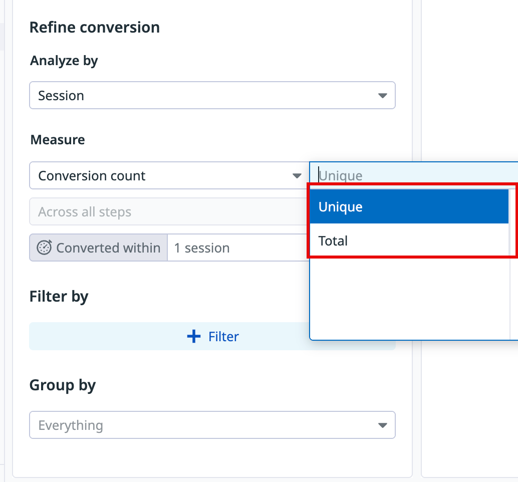 Unique: Counts conversion only once per session, user, or account. For example, if the user completes the funnel sequence A → B → C multiple times within the same session (for example, A, B, C, A, B, C), it counts as one conversion. The Unique setting counts only the first conversion per session (or per user, depending on your analysis scope).