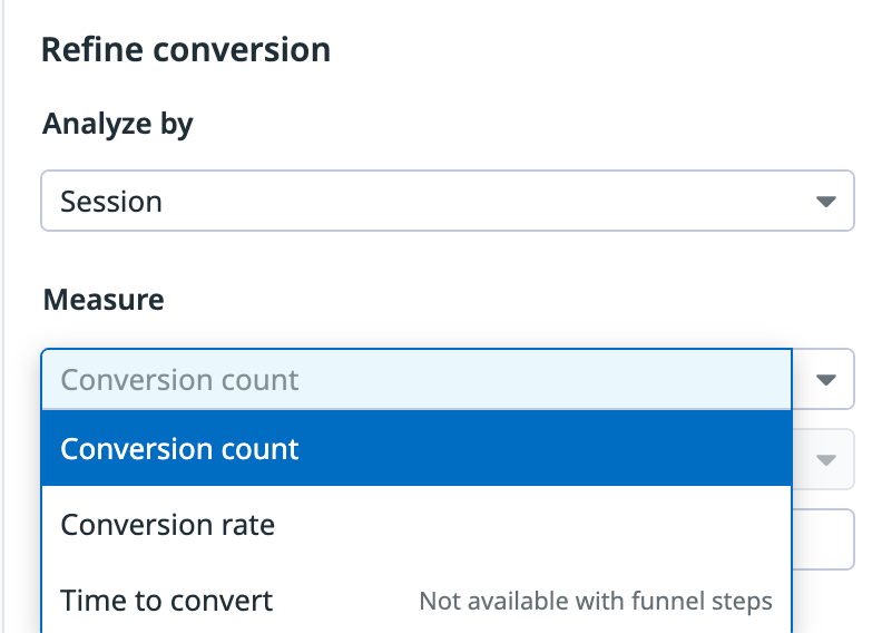 - Time to convert: The time it took for the user to complete the step events. This option is not available for the funnel steps visualization; if you select it, the visualization automatically changes to a timeseries.