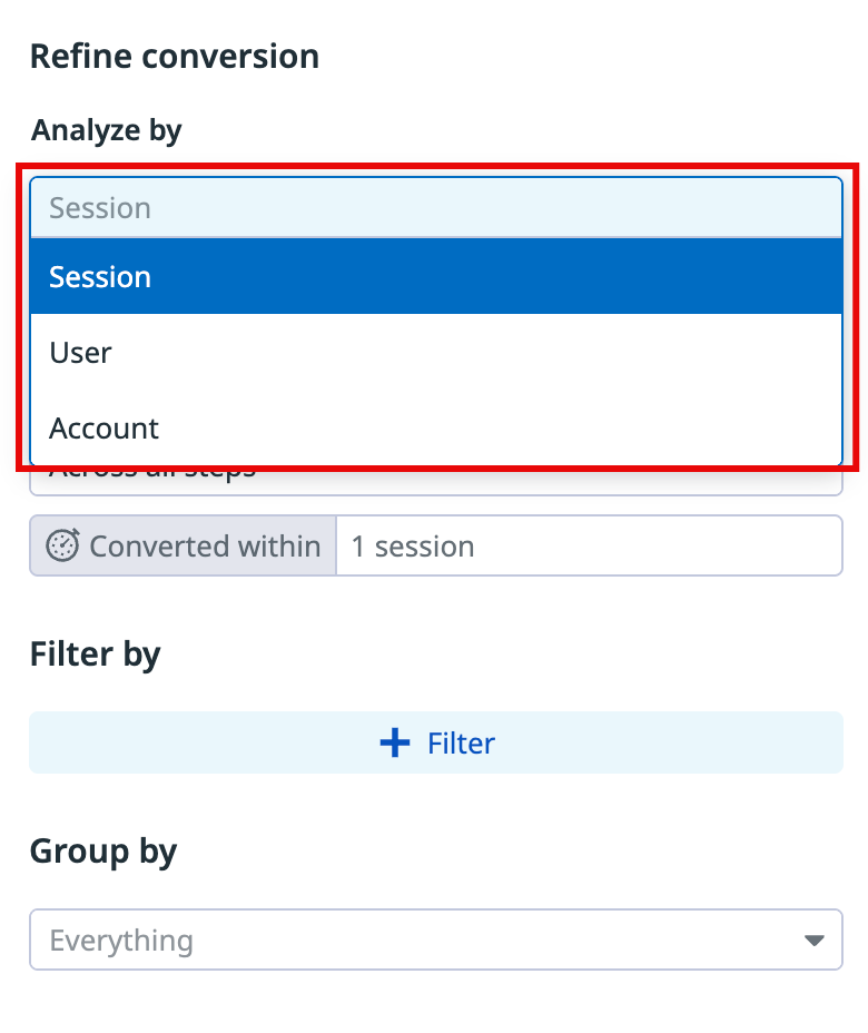 You can analyze conversion by session, user or account. This can be useful if you suspect, for instance, that a minority of your user base converts at a high rate.