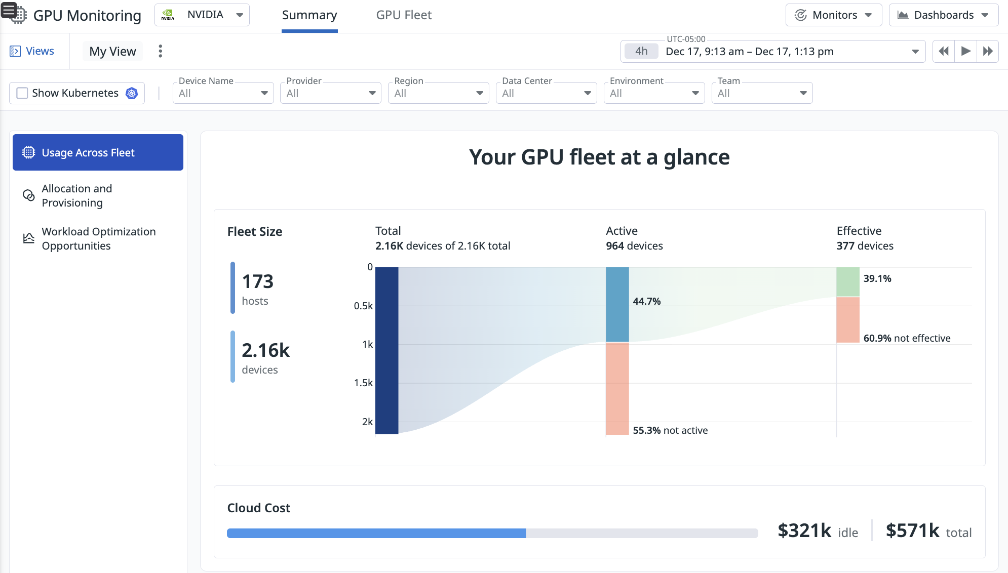 Datadog’s GPU Monitoring provides a centralized view into your GPU fleet’s health, cost, and performance. It enables teams to make better provisioning decisions, optimize and troubleshoot AI workload performance, and eliminate idle GPU costs without having to manually set up individual vendor tools (like NVIDIA’s DCGM). GPU Monitoring supports fleets deployed across the major cloud providers (AWS, GCP, Azure, Oracle Cloud), hosted on-premises, or provisioned through GPU-as-a-Service platforms like Coreweave and Lambda Labs.
