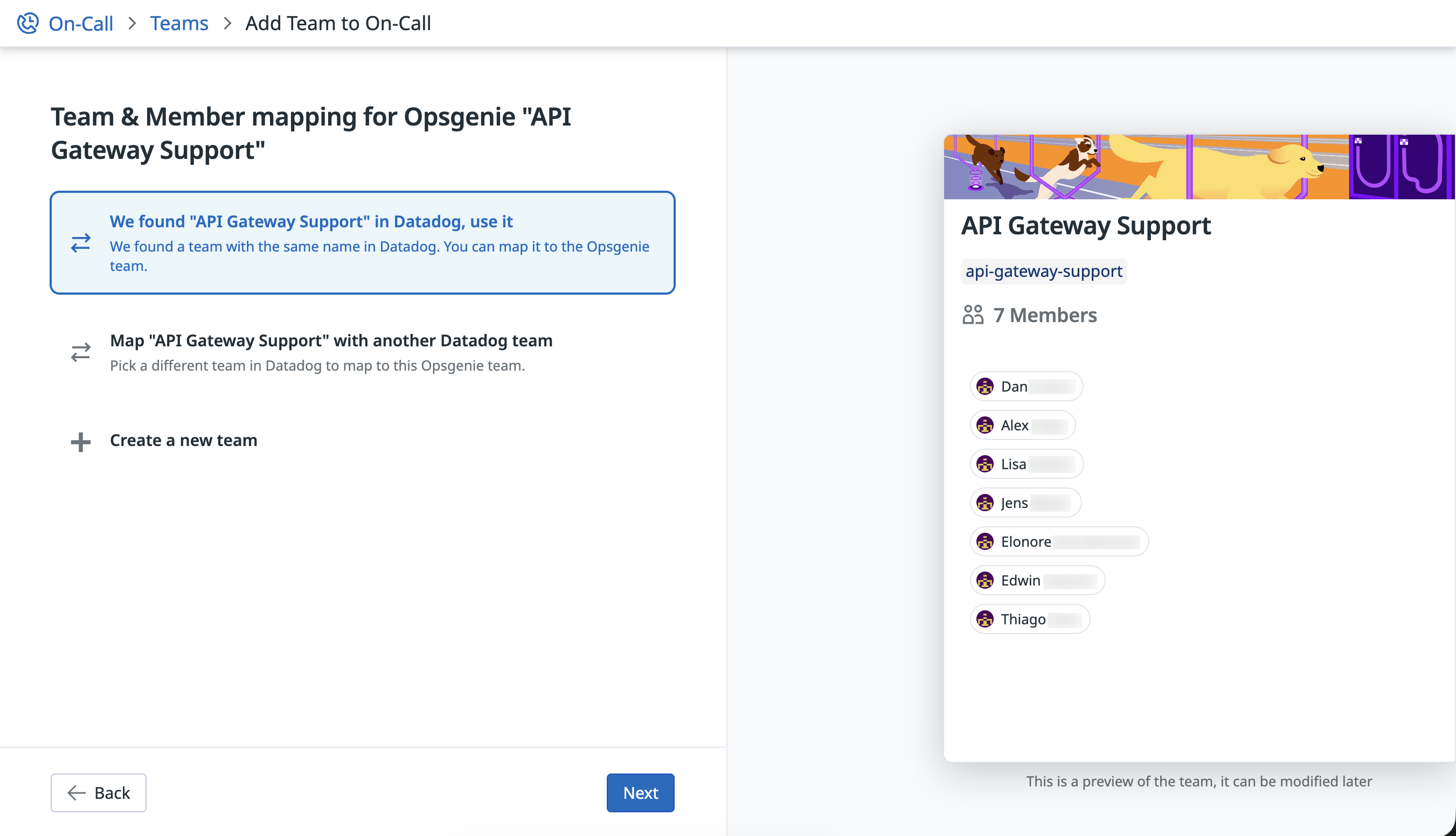 - Datadog loads all your OpsGenie teams in a searchable, paginated list. Select the team to migrate, then select Next. A preview pane shows the team’s members and settings.